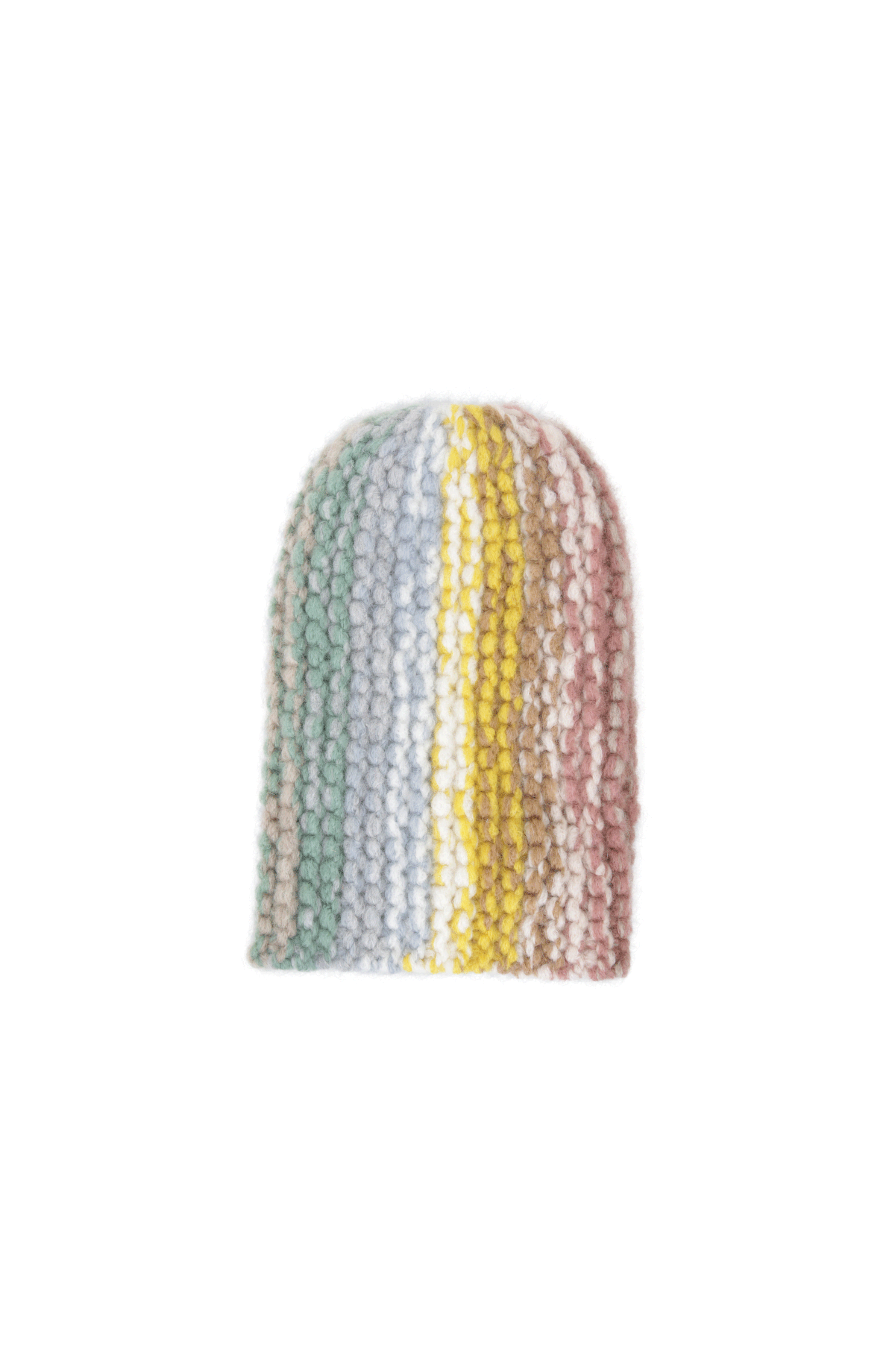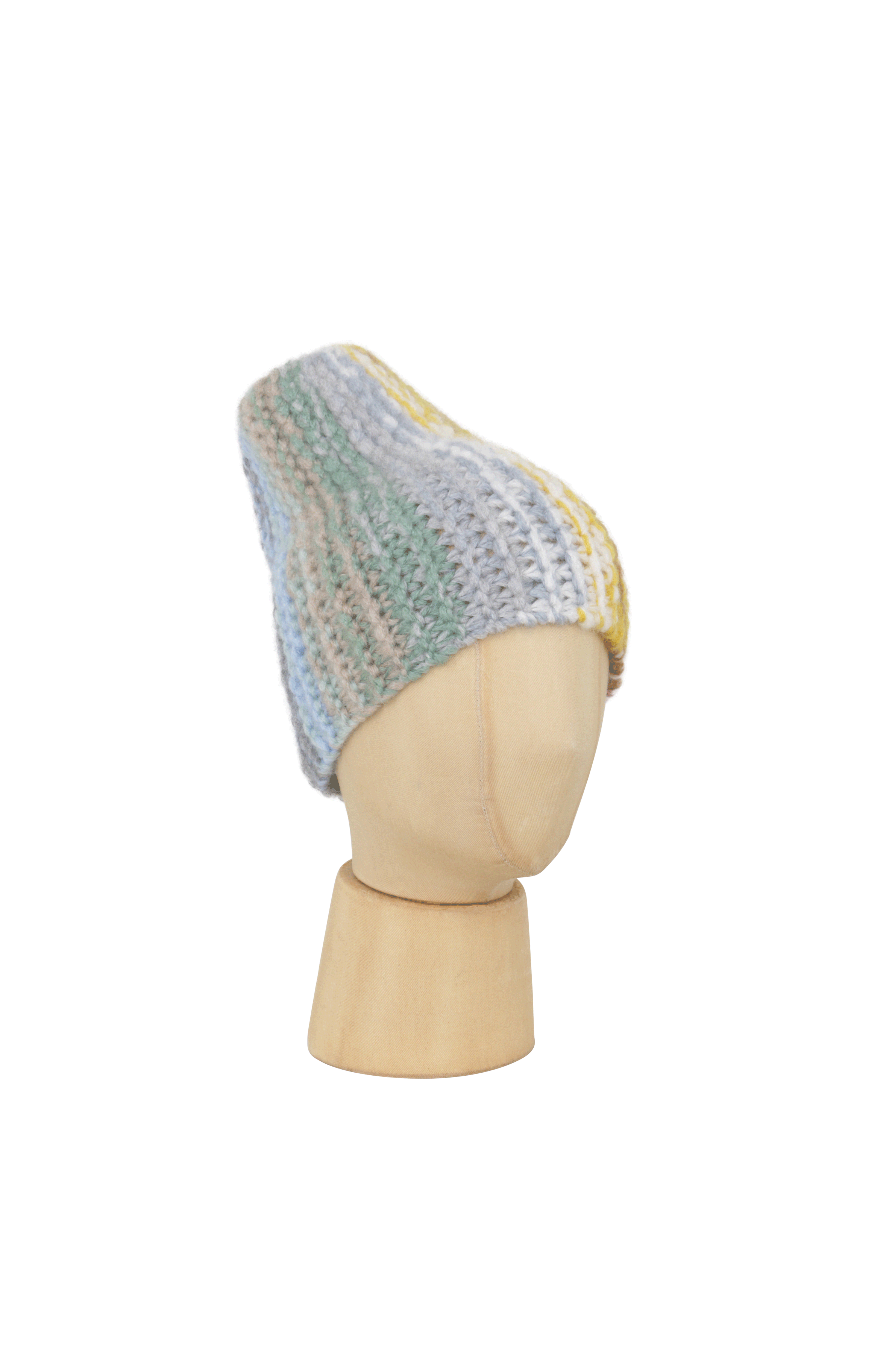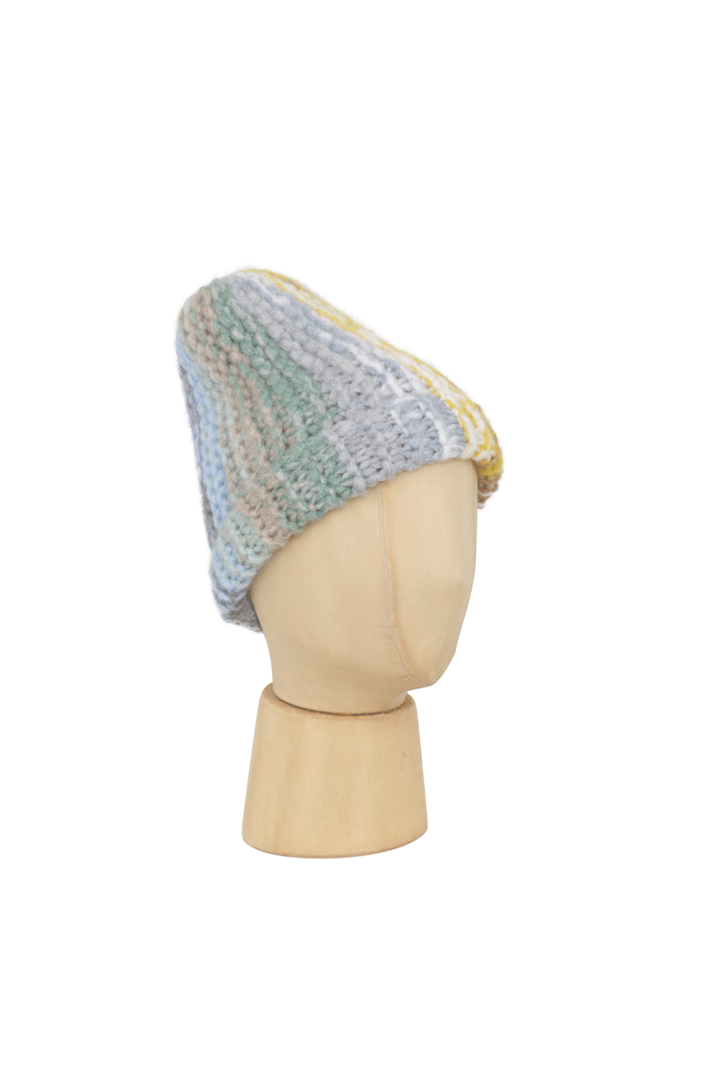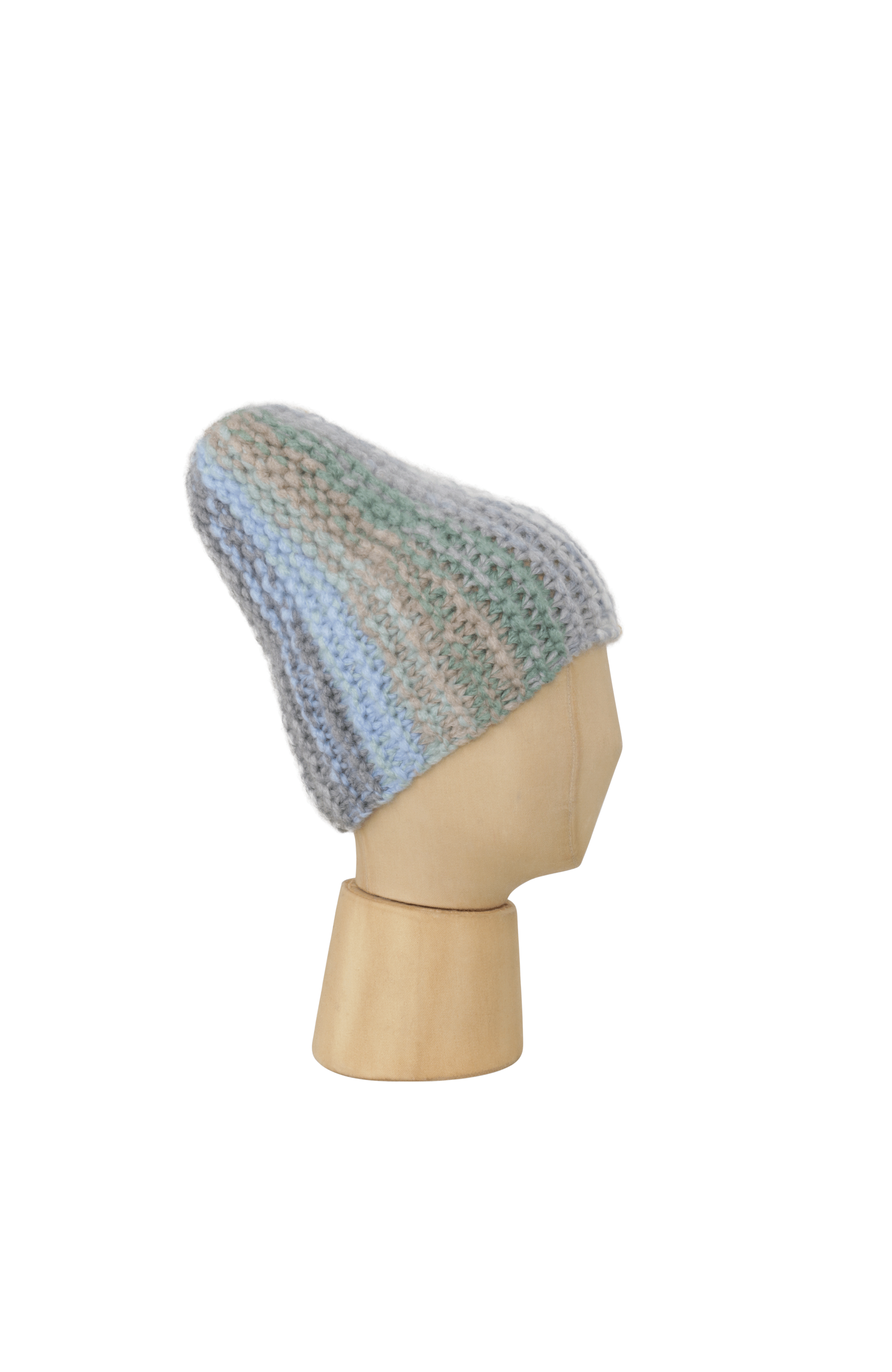 Das Besondere an dieser Mütze ist die außergewöhnliche Strickart: Sie wird in linker Maschenoptik handgestrickt, was ihr eine markante, moderne Textur und eine ganz eigene Ästhetik verleiht. Gefertigt aus feinstem Kaschmir, überzeugt sie durch eine luxuriöse Haptik – weich wie Seide, ganz ohne Kratzen. Das Bi-Color-Design in harmonisch aufeinander abgestimmten Multi-Color-Tönen unterstreicht den stilvollen Look.