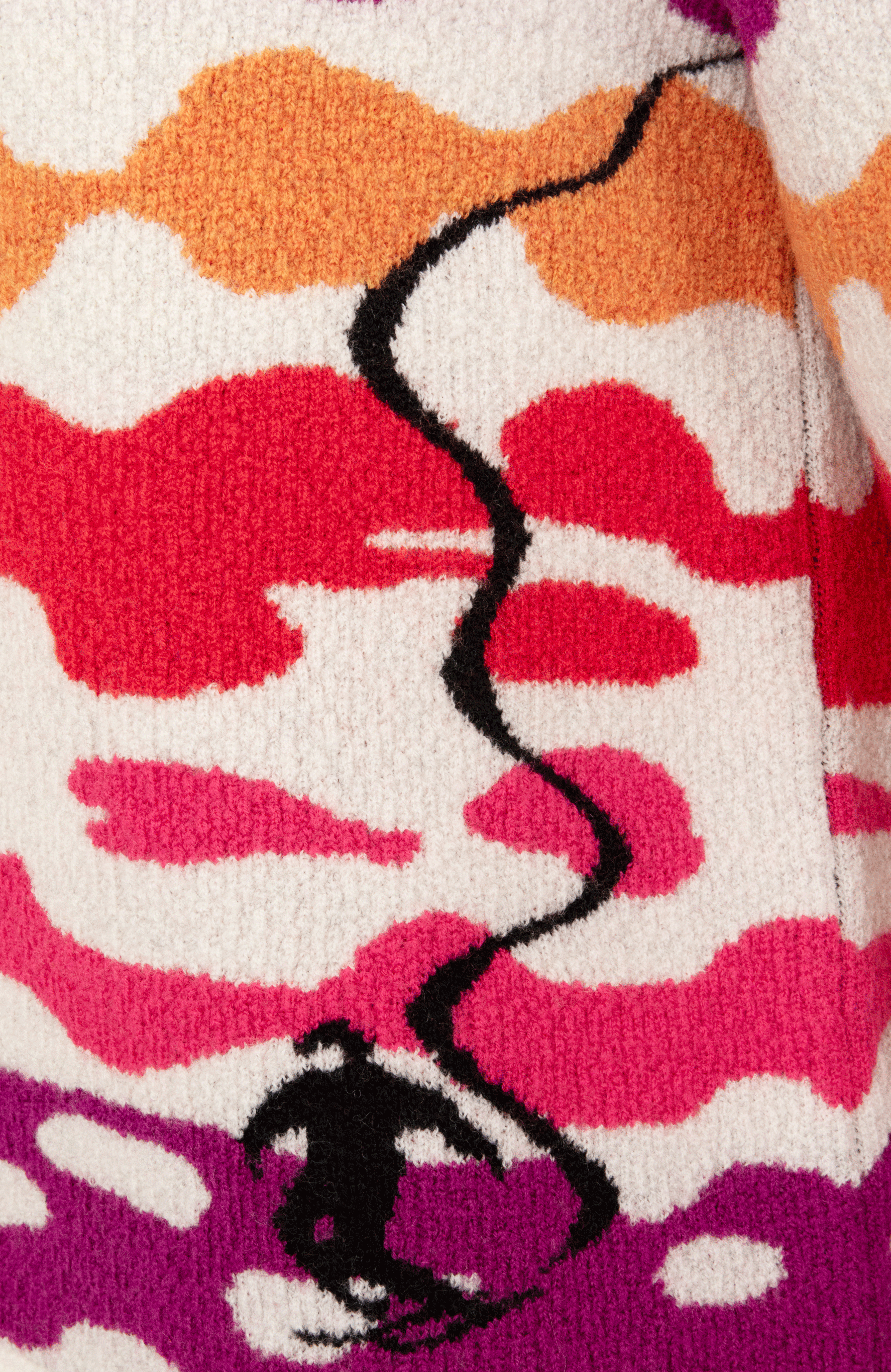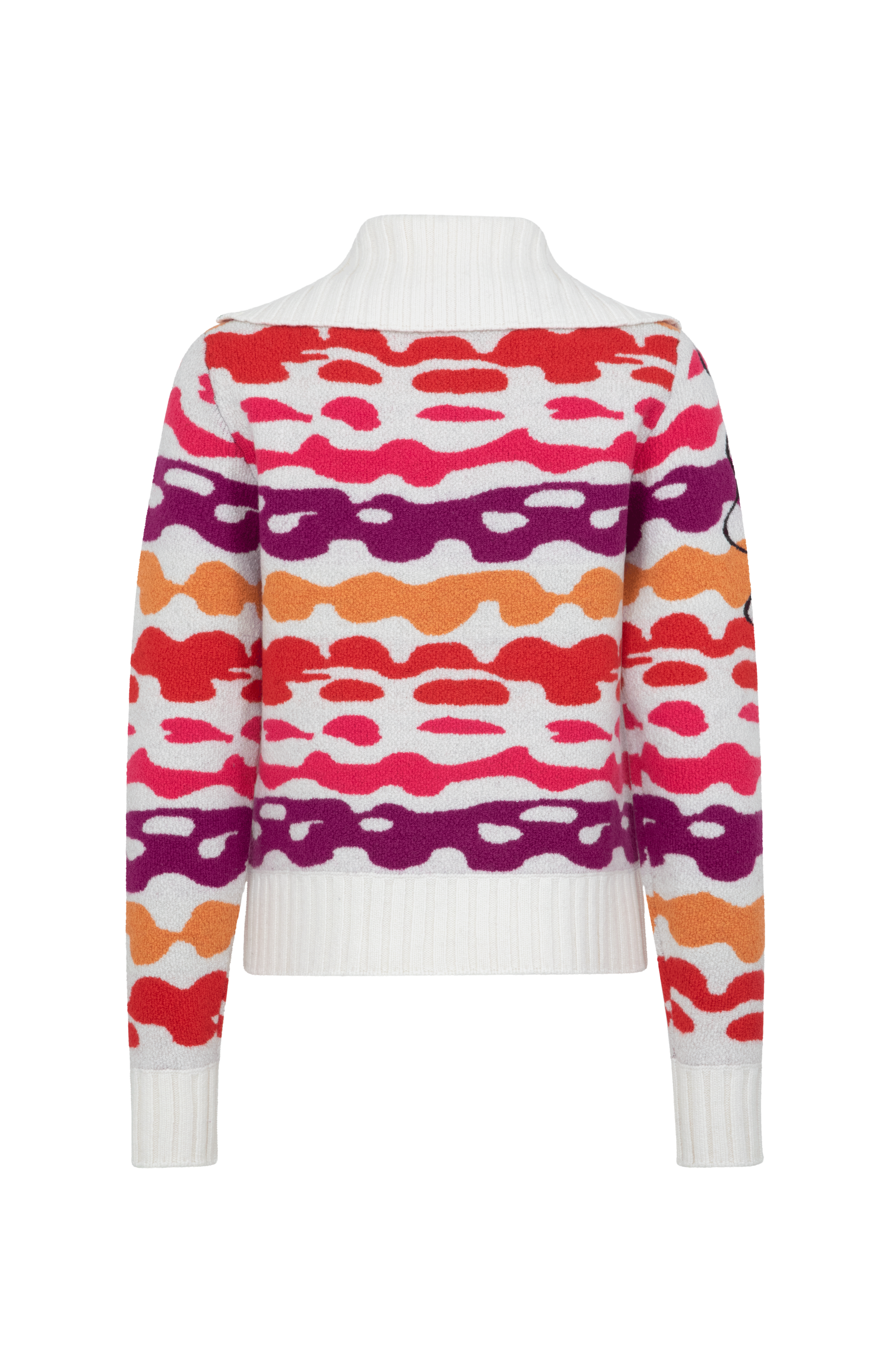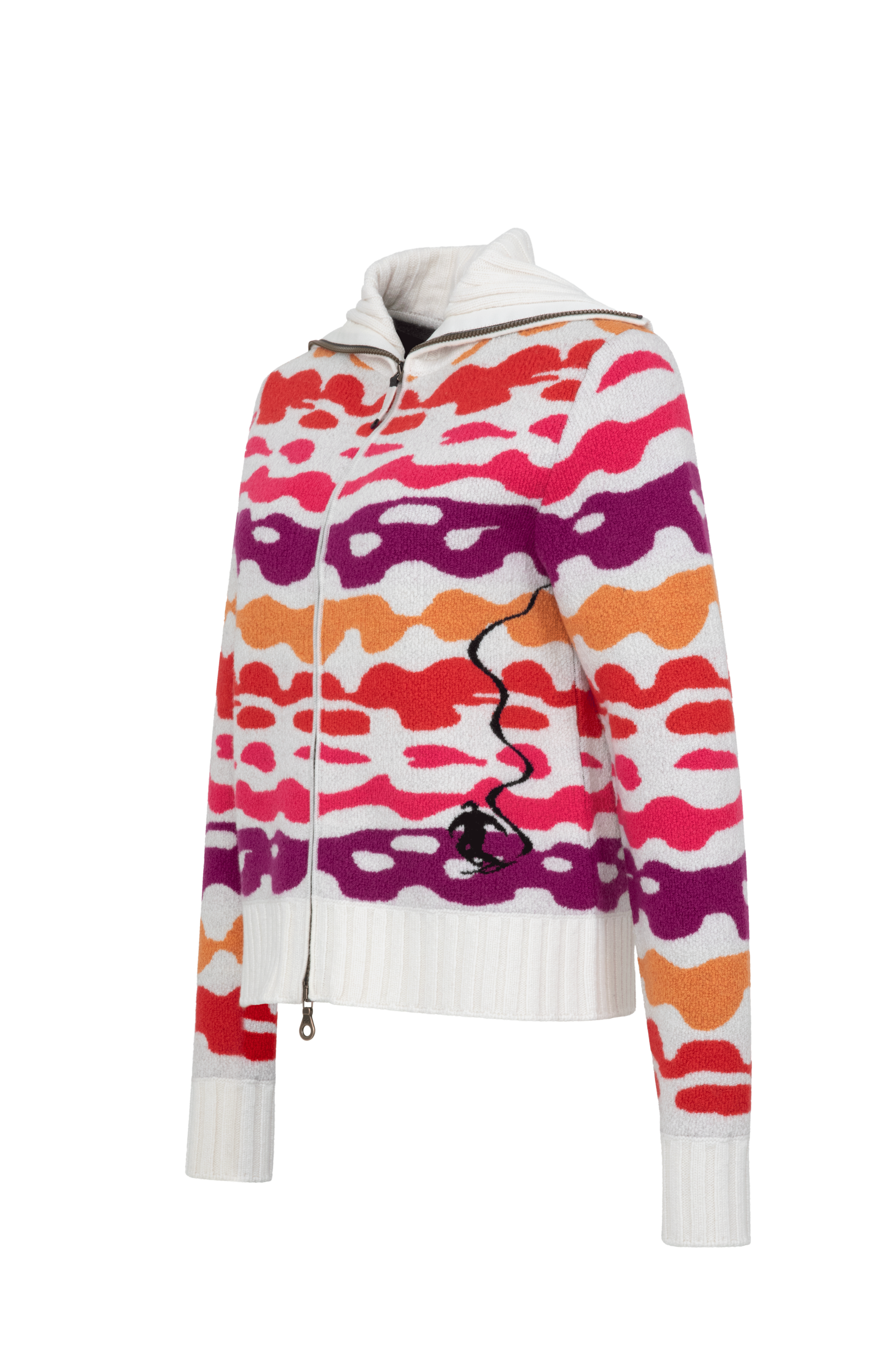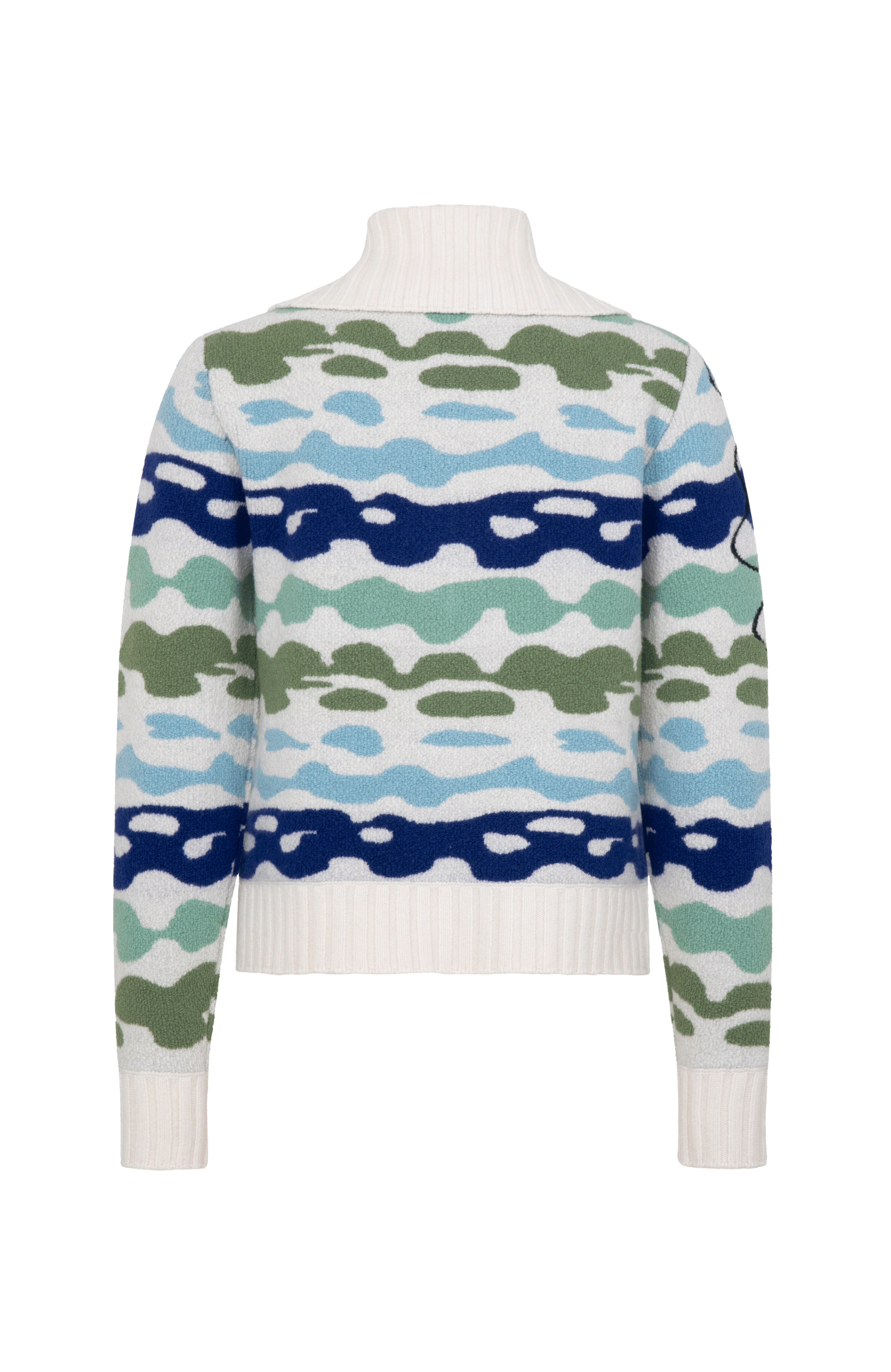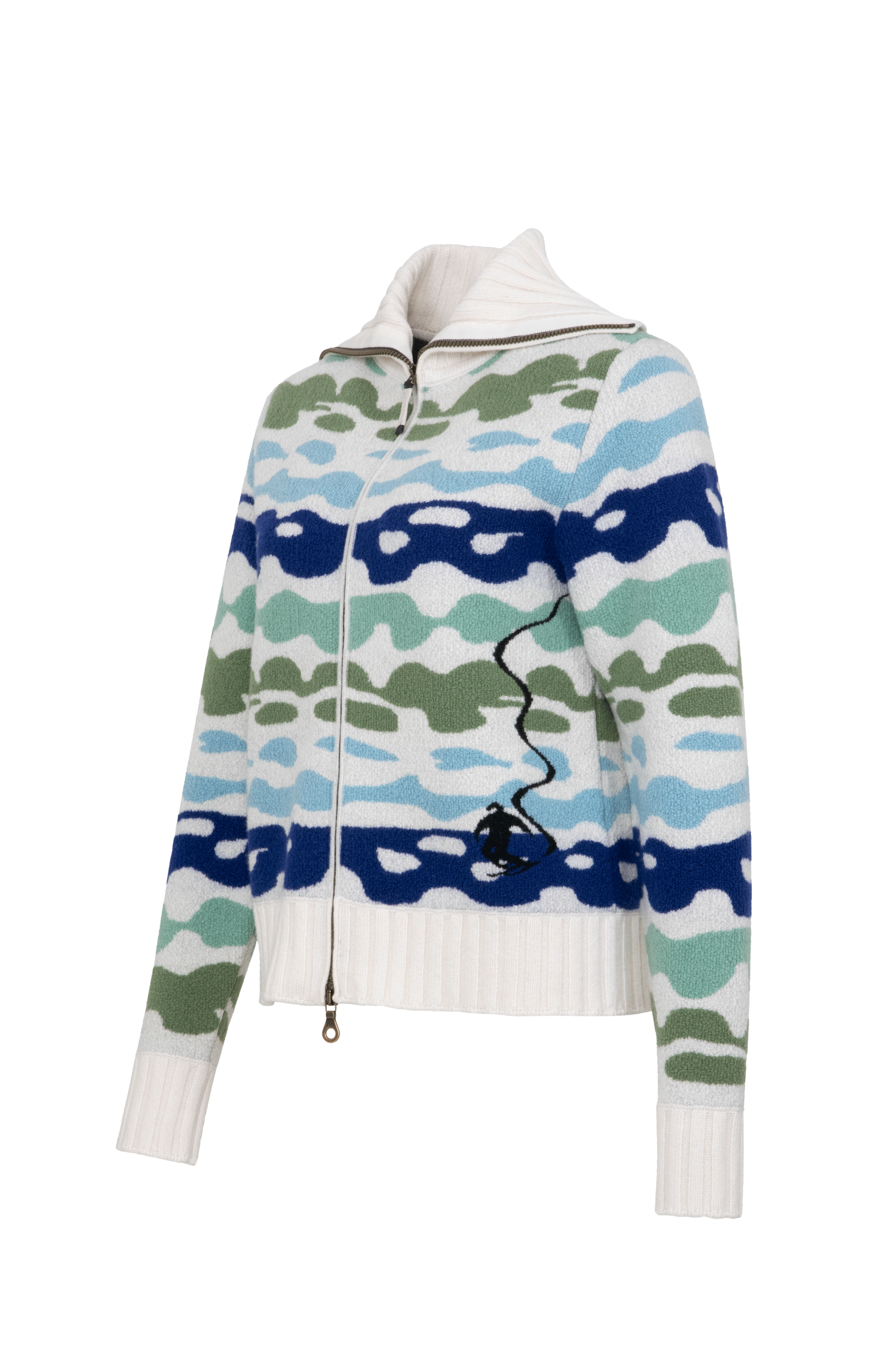 Das Garn der Merino Extrafine Qualität (100% extrafine Merino Wool) besticht durch seine feine Qualität. Merinogarne sind besonders leicht im Gewicht und weich vom Griff und deshalb äußerst angenehm auf der Haut zu tragen. Die Merinowolle wird zu einem Jacquard (eine Stricktechnik) verarbeitet, um farbige Motive in ein Gestrick einarbeiten zu können. Das Garn wird in Italien produziert und dort auf Maschinen mit höchstem technischen Standard gestrickt. Bei dem Model verschmelzen die Welten Kunst und Mode ineinander. Das Ergebnis sind skizzierte Landschaften, urbane Umgebungen und dynamische Skifahrer, umgesetzt im Merino Jaquard Strick.