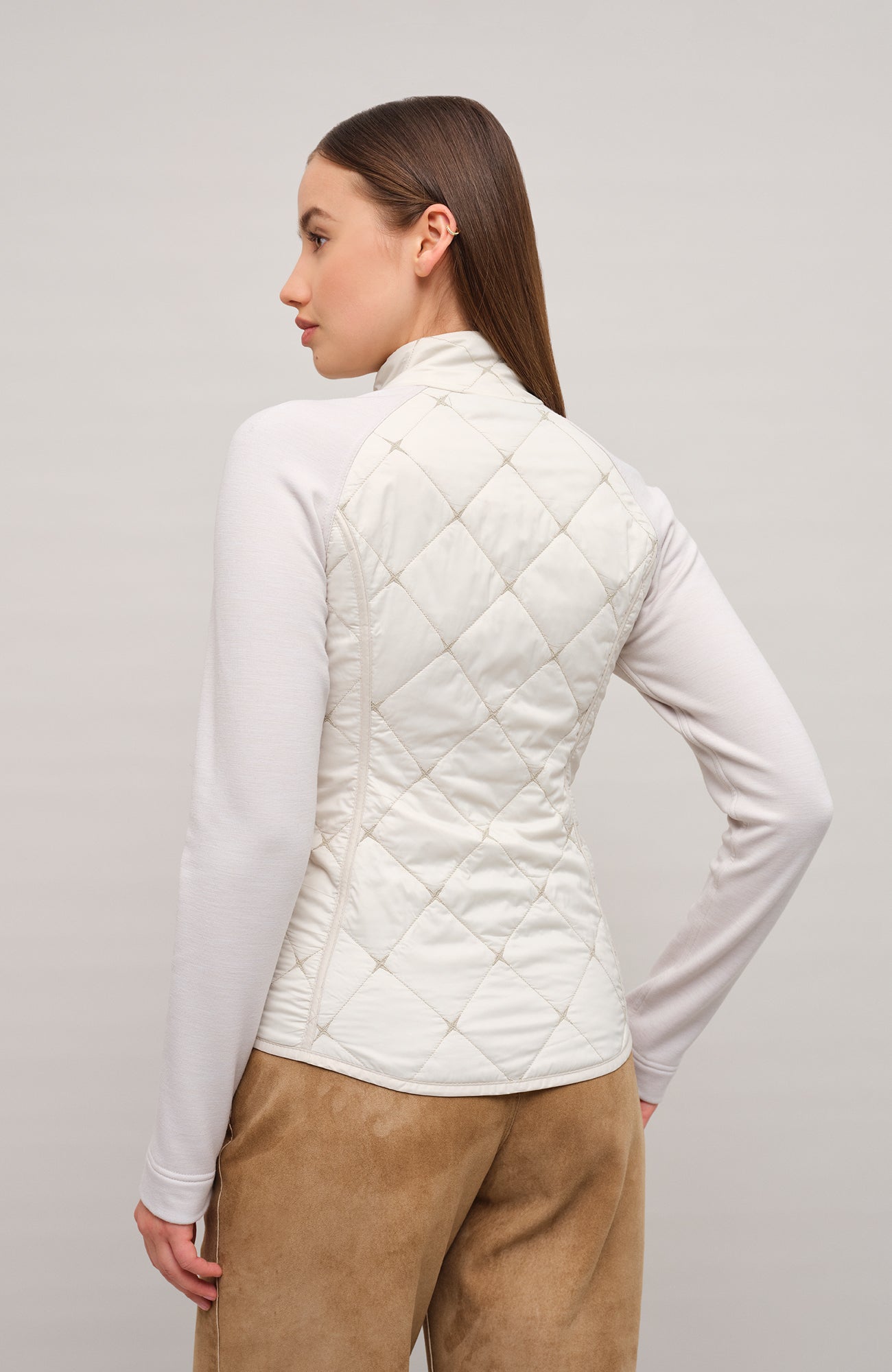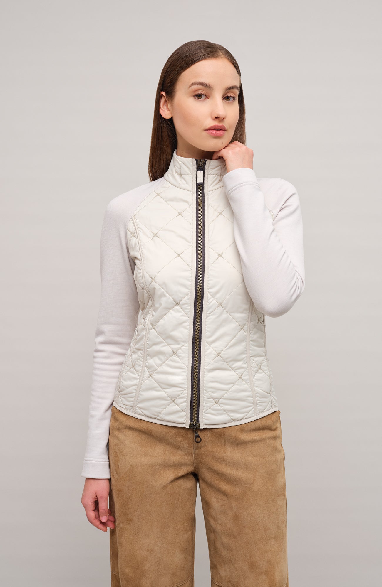 Die Kombination aus gestepptem Nylon und weichem Wool Powerstretch vereint funktionale Wärme mit femininer Eleganz. Schützendes Nylon bewahrt vor Wind und Kälte, während die aufgeraute Innenseite des Powerstretch für natürlichen Tragekomfort sorgt. Ideal für aktive Tage mit Stilanspruch.