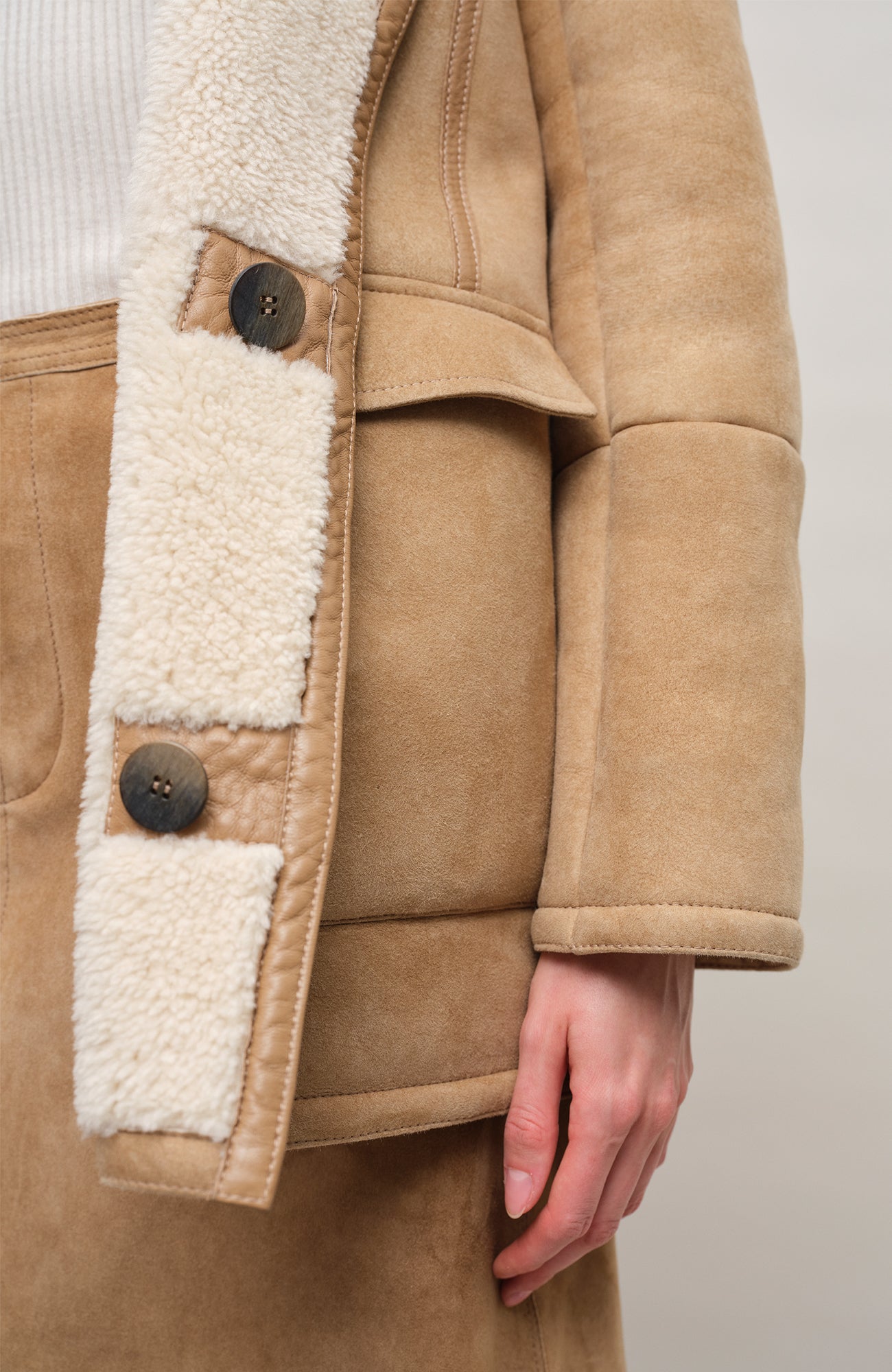 Merinillo Vintage ist ein Lammfell, das von etwas größeren spanischen Lämmern stammt und sich durch sein auffallend weiches und dickes Fell auszeichnet. Der hohe Komfort, der von einem besonders leichte Tragegefühl unterstrichen wird, macht das Material zusammen mit dem ausgewaschenen Effekt, der durch einen doppelten Färbeprozess entsteht, so besonders. Entscheidet man sich beim Tragen für die Fellseite, wird die offenkantige Nahtverarbeitung zum zusätzlichen optischen Highlight.