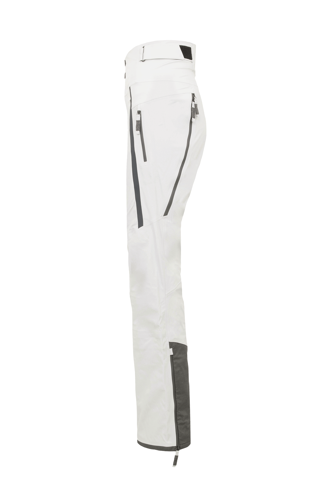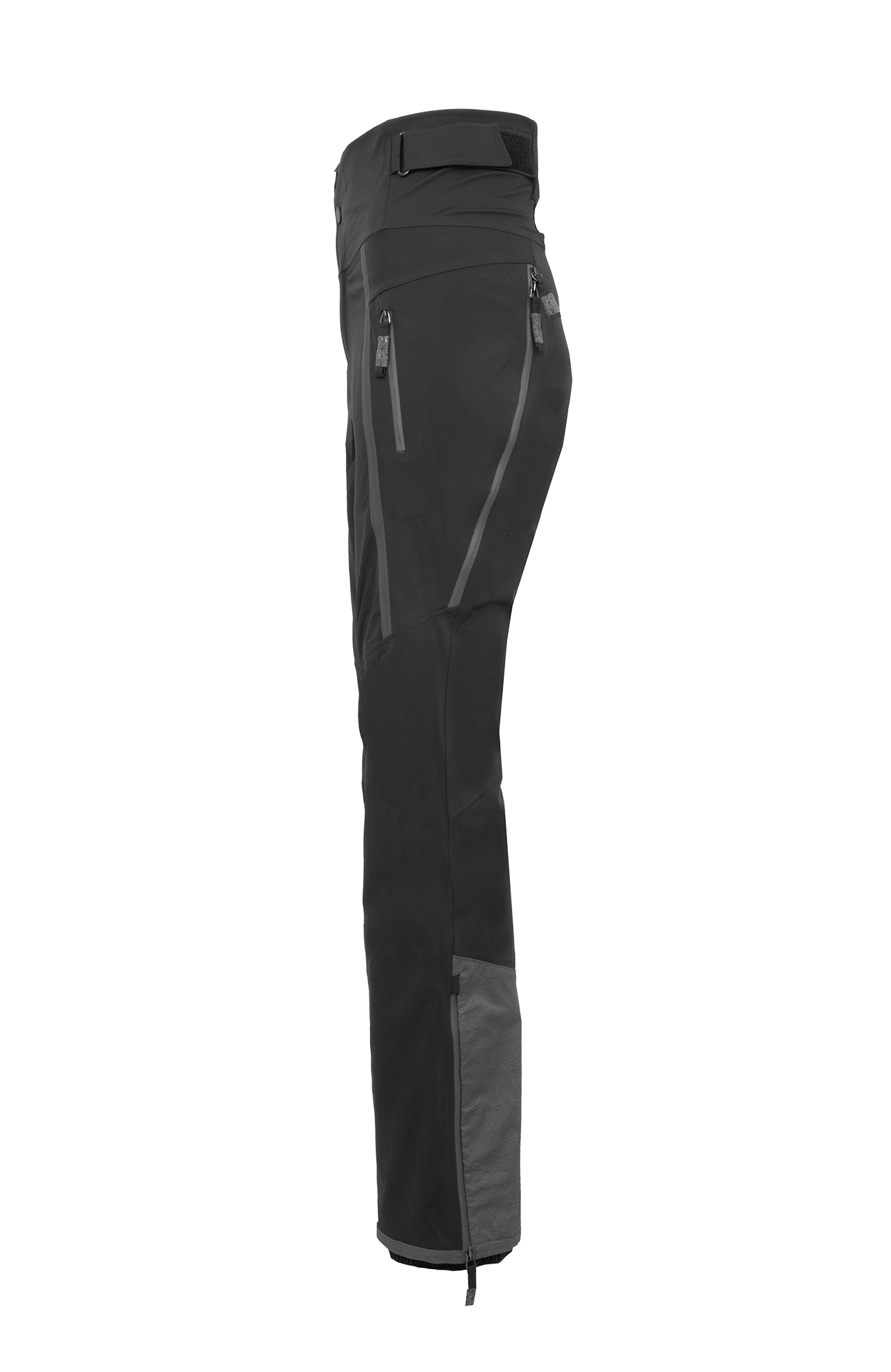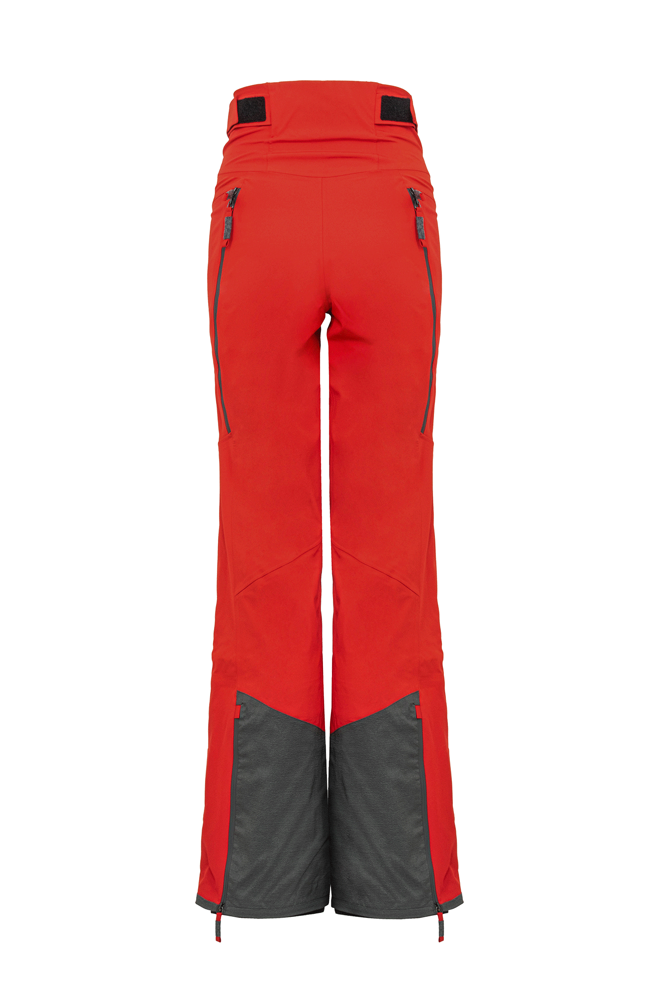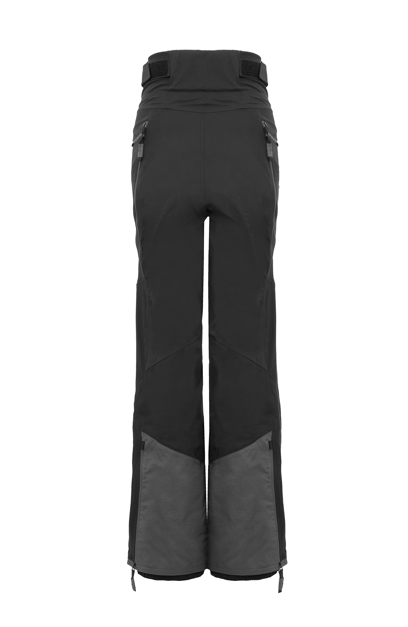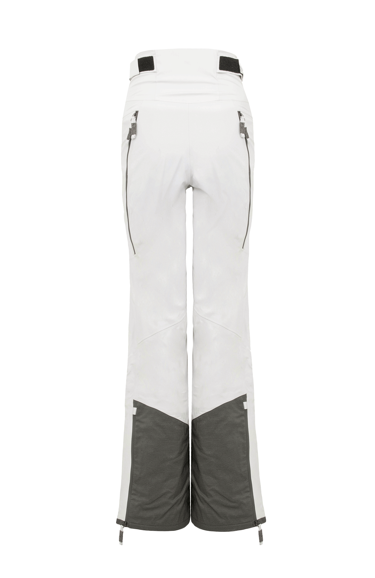 Die Oberfläche ist mit der technischen Membran und dem Futter verbunden. Die Nähte sind wasserdicht verschweißt. Umfassende Funktion bieten der Kantenschutz aus Alcanataraleder, die Zipper, die fast bis zu den Knien reichen, sowie der Schneefang mit Gummibund. Das Rumpfteil ist etwas höher geschnitten und reicht bis über die Taille. Mit einem Klett lässt sich die Bundweite individuell anpassen. Die beiden Knöpfe wurden asymmetrisch angebracht, was die Taille optisch schmäler wirken lässt. Wird es während einer Schneetour wärmer oder kommt man auf der Piste ins Schwitzen, kann man die Zipper an der Beinrückseite öffnen.