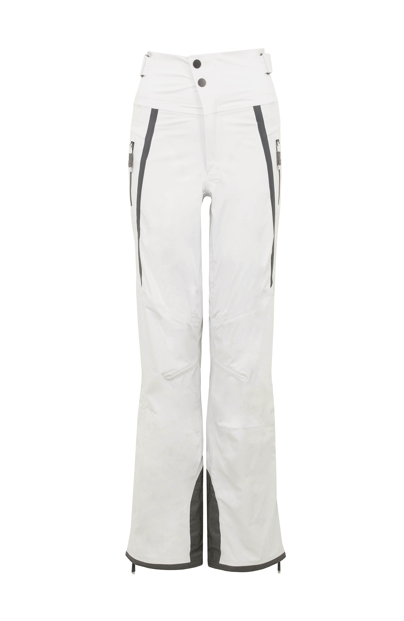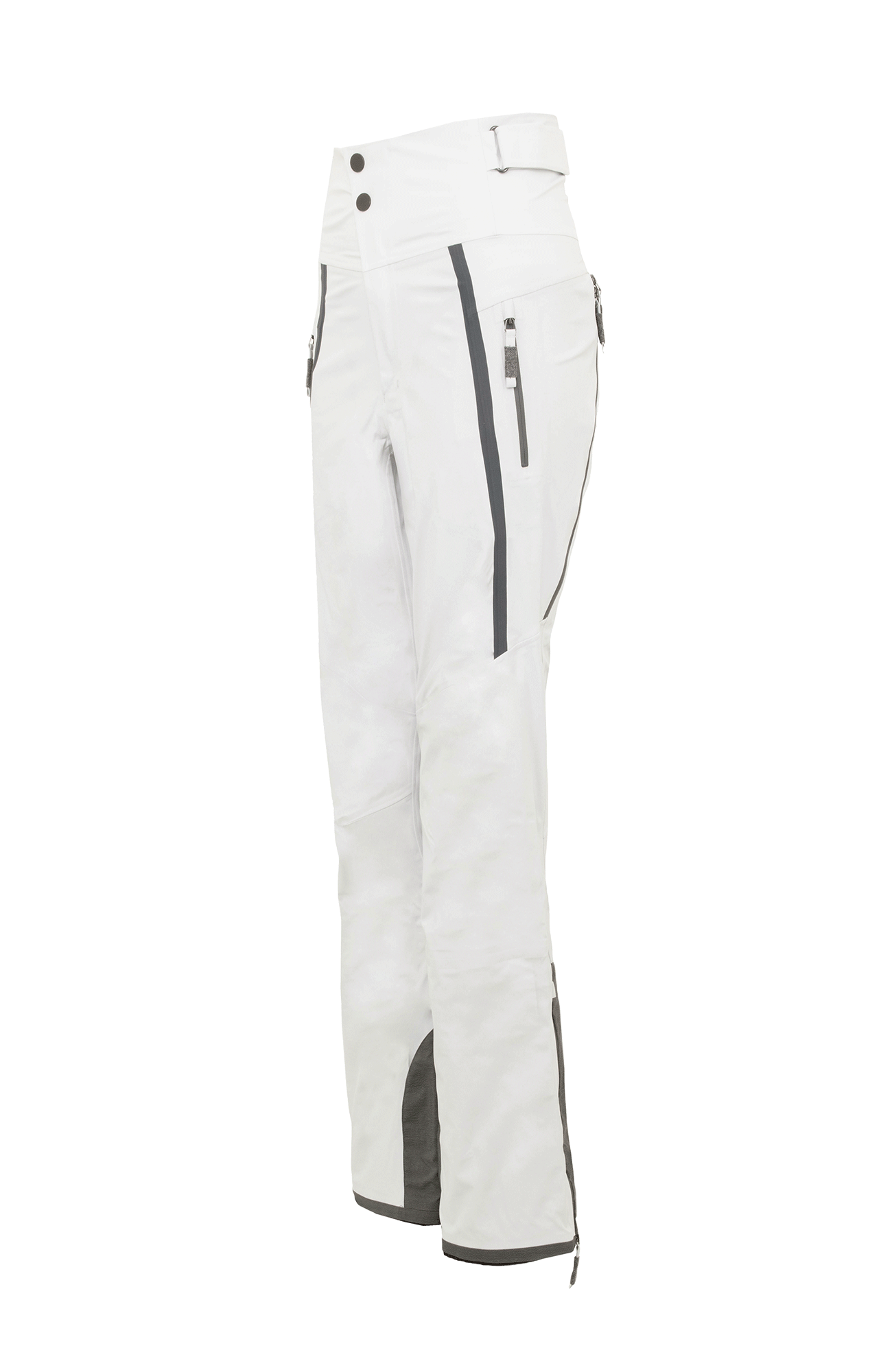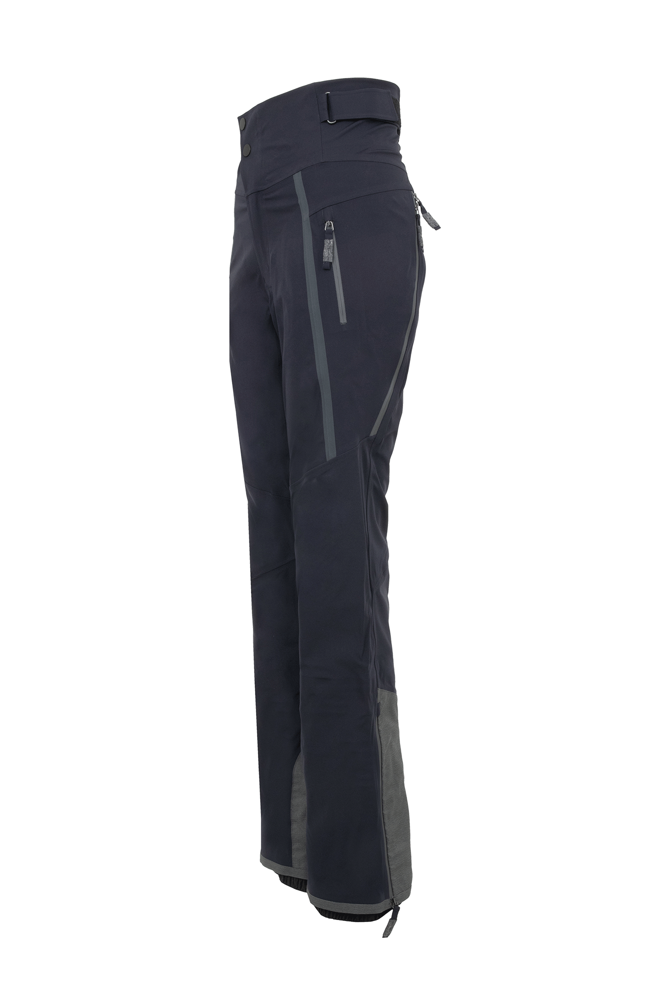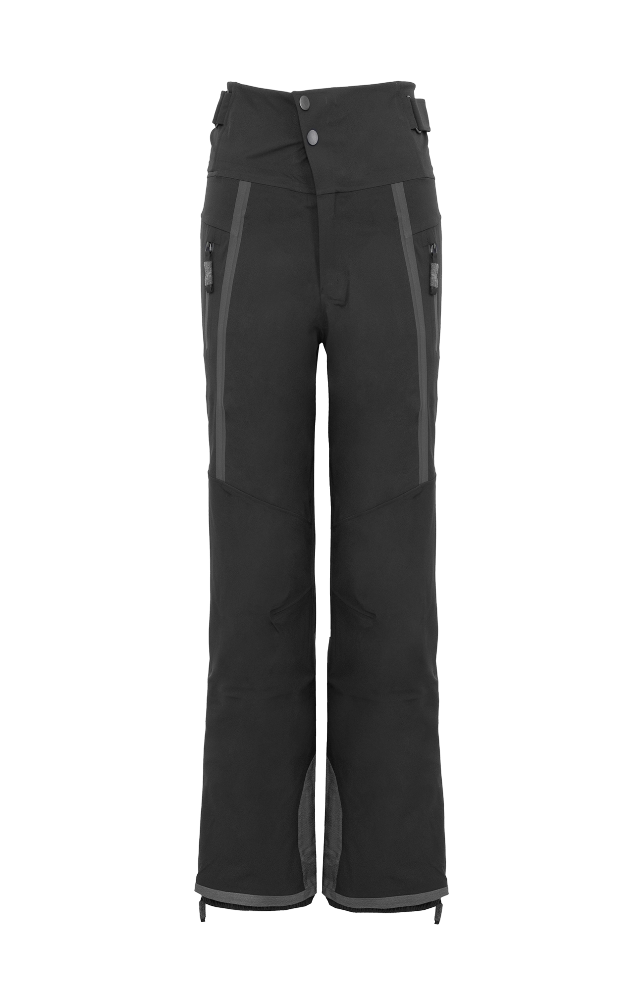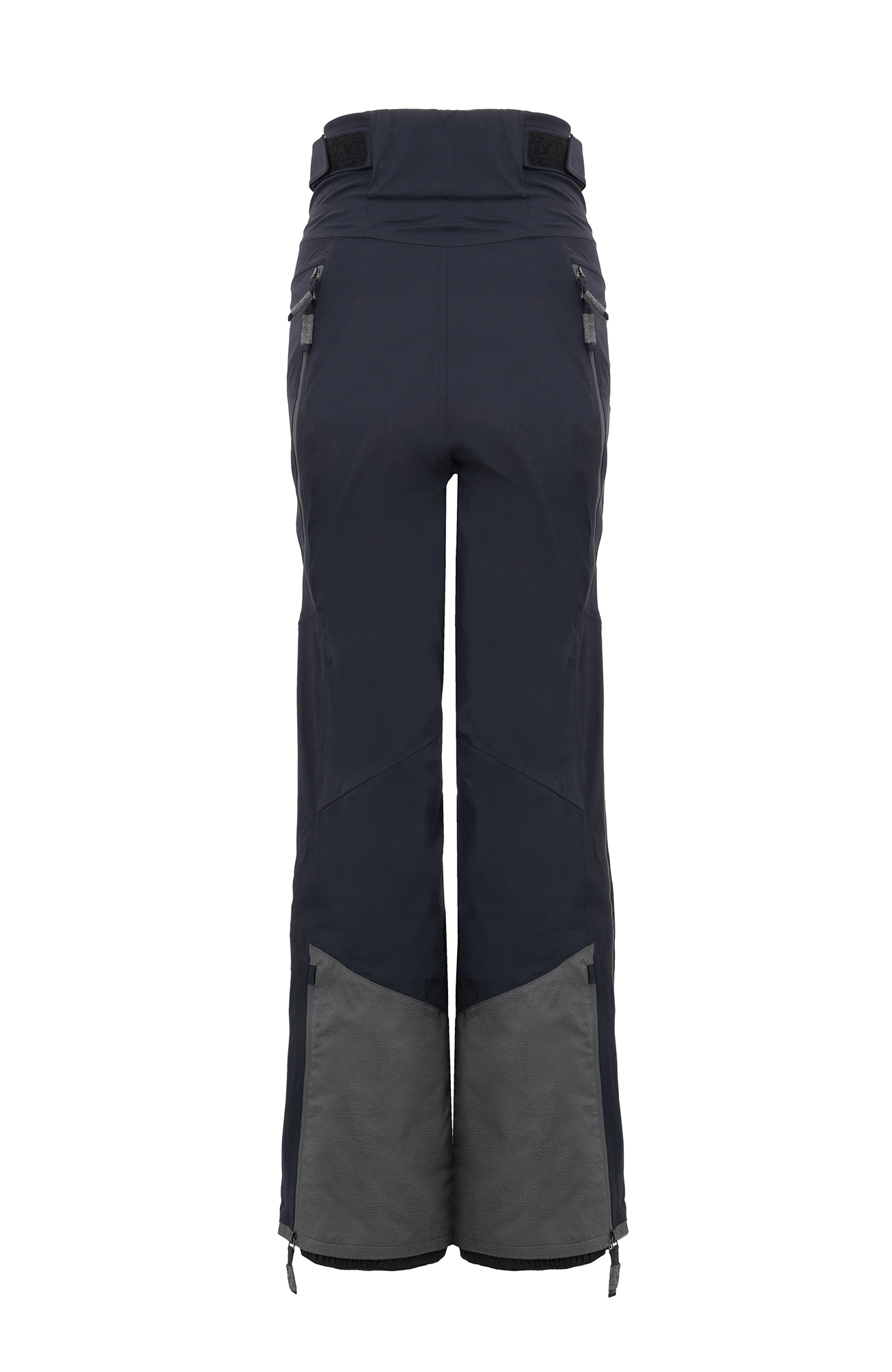 Die Oberfläche ist mit der technischen Membran und dem Futter verbunden. Die Nähte sind wasserdicht verschweißt. Umfassende Funktion bieten der Kantenschutz aus Alcanataraleder, die Zipper, die fast bis zu den Knien reichen, sowie der Schneefang mit Gummibund. Das Rumpfteil ist etwas höher geschnitten und reicht bis über die Taille. Mit einem Klett lässt sich die Bundweite individuell anpassen. Die beiden Knöpfe wurden asymmetrisch angebracht, was die Taille optisch schmäler wirken lässt. Wird es während einer Schneetour wärmer oder kommt man auf der Piste ins Schwitzen, kann man die Zipper an der Beinrückseite öffnen.