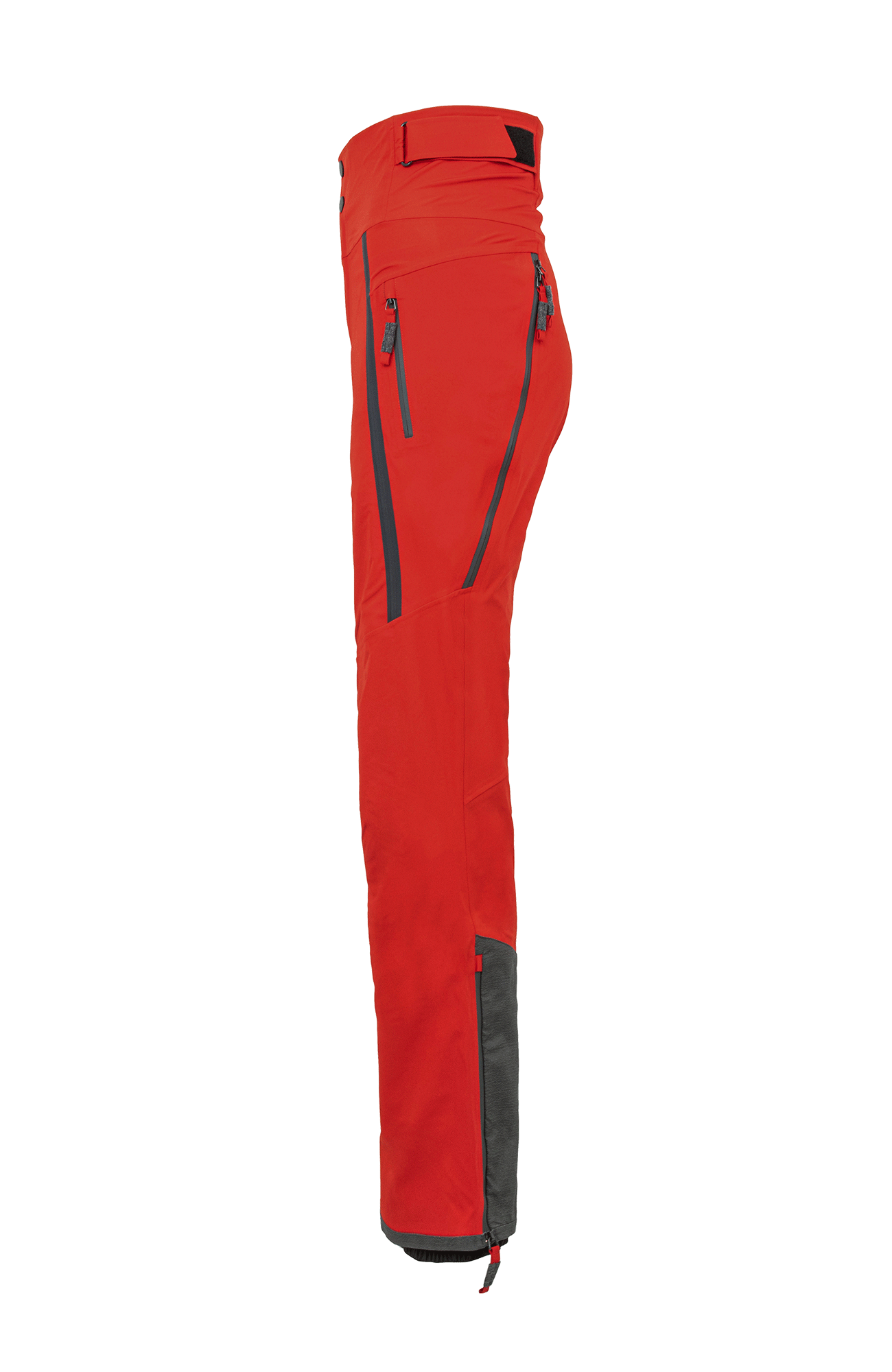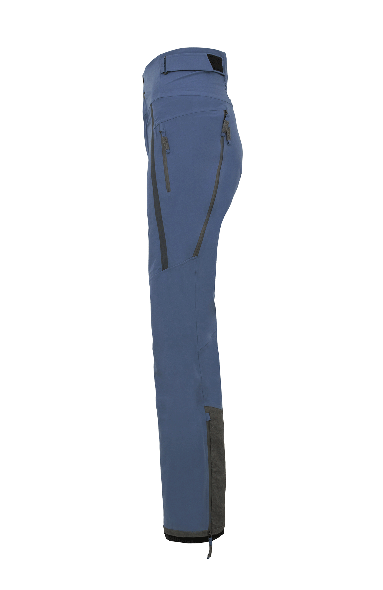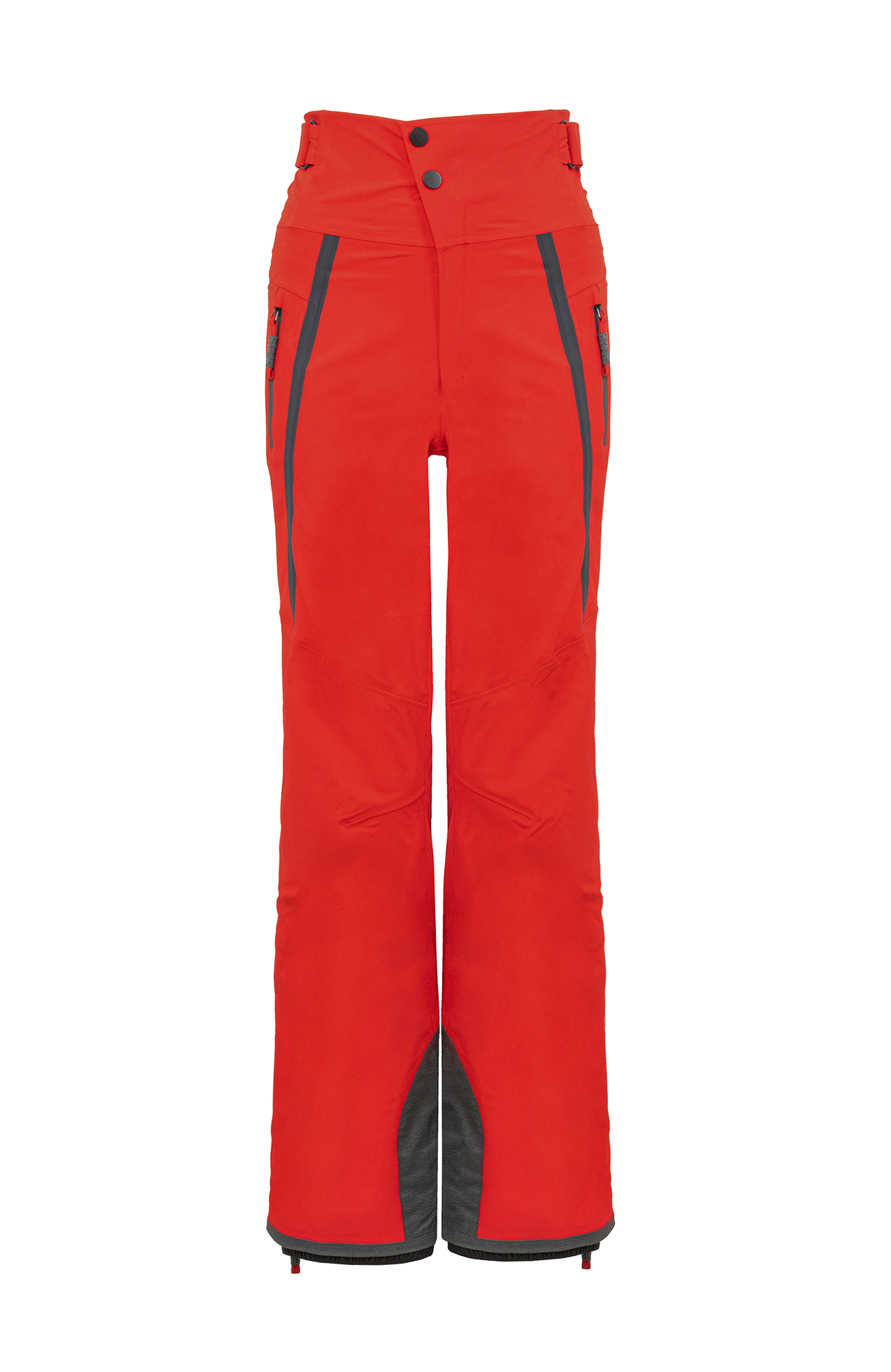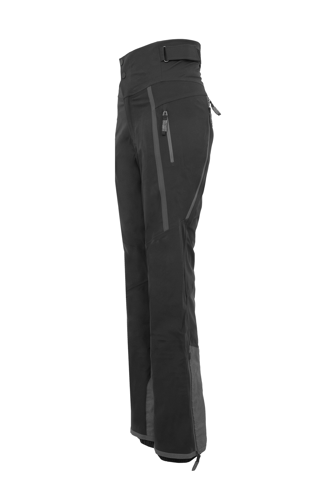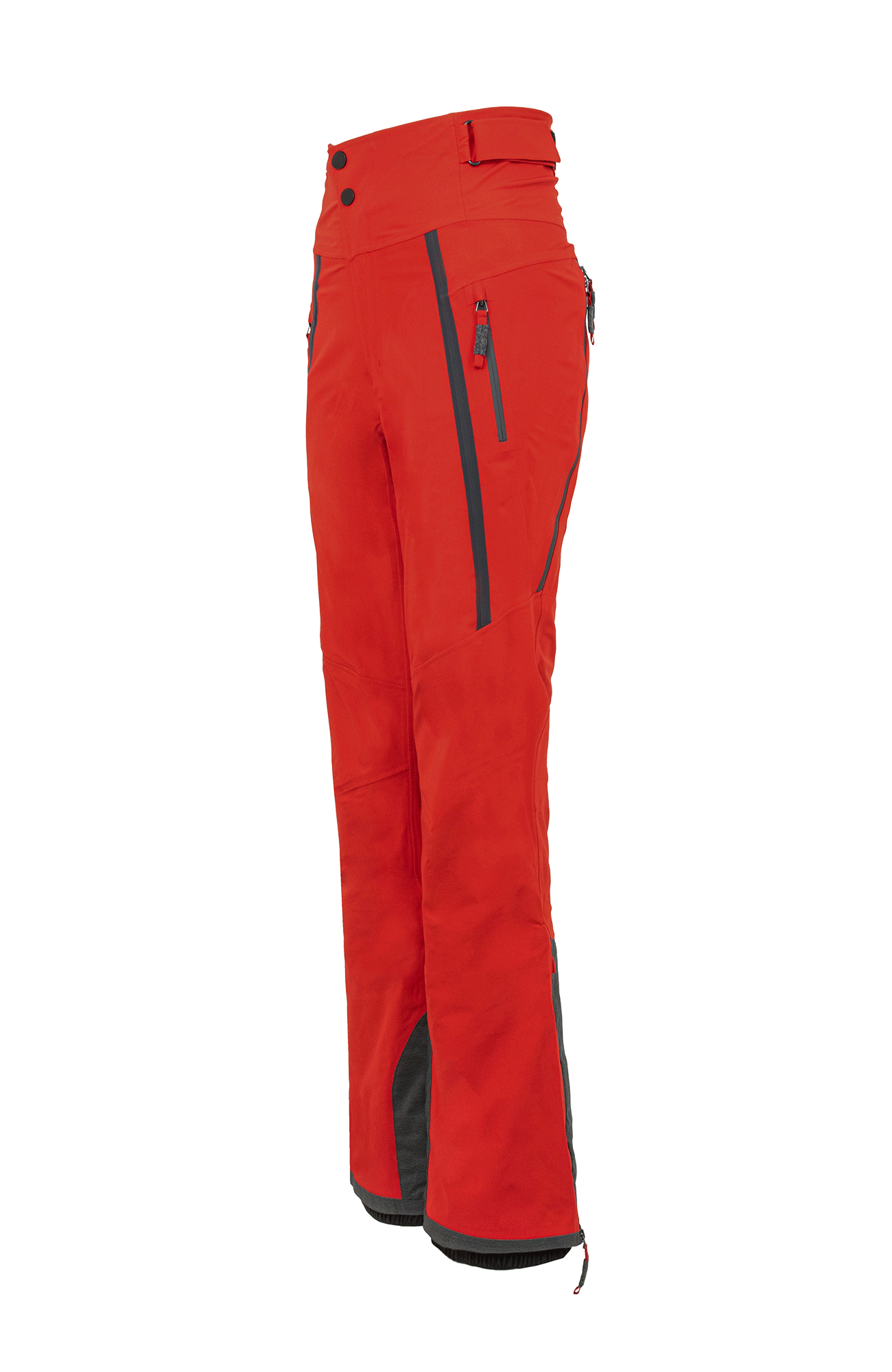 Die Oberfläche ist mit der technischen Membran und dem Futter verbunden. Die Nähte sind wasserdicht verschweißt. Umfassende Funktion bieten der Kantenschutz aus Alcanataraleder, die Zipper, die fast bis zu den Knien reichen, sowie der Schneefang mit Gummibund. Das Rumpfteil ist etwas höher geschnitten und reicht bis über die Taille. Mit einem Klett lässt sich die Bundweite individuell anpassen. Die beiden Knöpfe wurden asymmetrisch angebracht, was die Taille optisch schmäler wirken lässt. Wird es während einer Schneetour wärmer oder kommt man auf der Piste ins Schwitzen, kann man die Zipper an der Beinrückseite öffnen.
