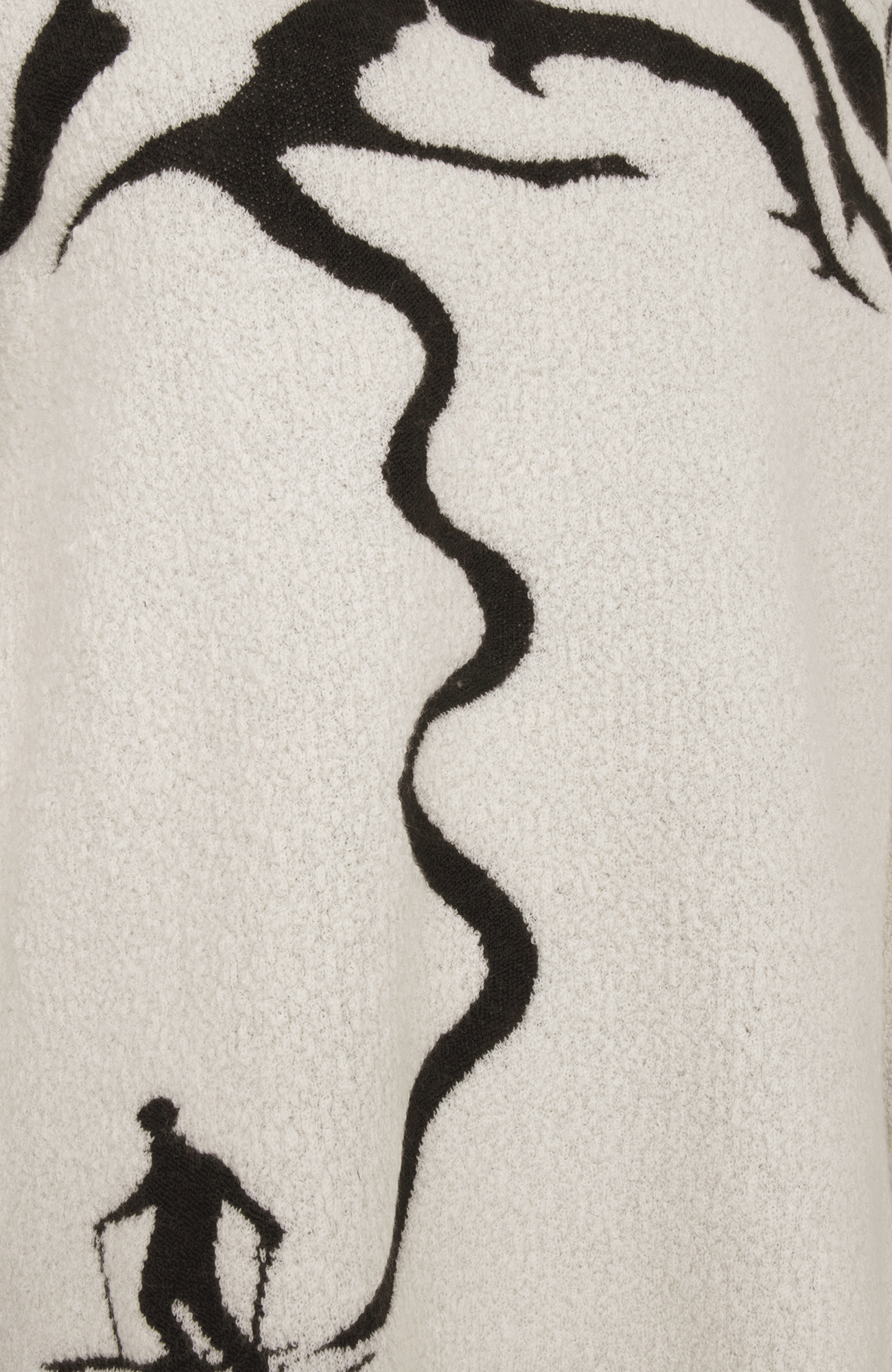 Das Garn der Merino Extrafine Qualität (100% extrafine Merino Wool) besticht durch seine feine Qualität. Merinogarne sind besonders leicht im Gewicht und weich vom Griff und deshalb äußerst angenehm auf der Haut zu tragen. Die Merinowolle wird zu einem Jacquard (eine Stricktechnik) verarbeitet, um farbige Motive in ein Gestrick einarbeiten zu können. Das Garn wird in Italien produziert und dort auf Maschinen mit höchstem technischen Standard gestrickt. Bei dem Model verschmelzen die Welten Kunst und Mode ineinander. Das Ergebnis sind skizzierte Landschaften, urbane Umgebungen und dynamische Skifahrer, umgesetzt im Merino Jaquard Strick.