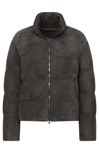 Daunenjacke aus Veloursleder von Frauenschuh Made in Italy Modell- Alpine CA in der Farbe elefant Vorderansicht am Model.