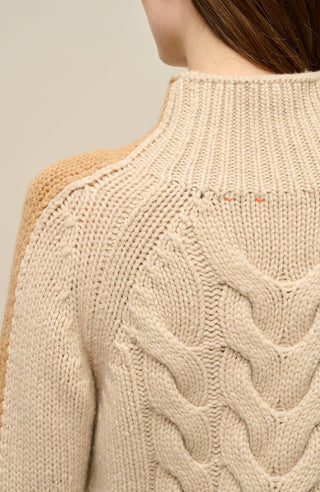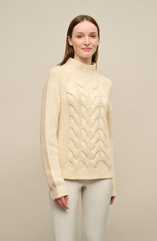 SaraCable cashmere sweater with stand-up collar, cable knit pattern, and retro stripes—soft, stylish, and ideal for fall days.