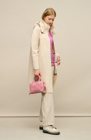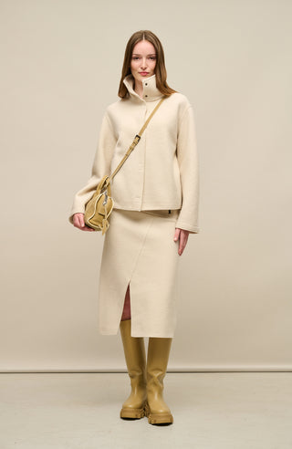 A special cooked wool set with the Delia jacket and the Zita skirt with the versatile and practical Hampton Small leather bag.