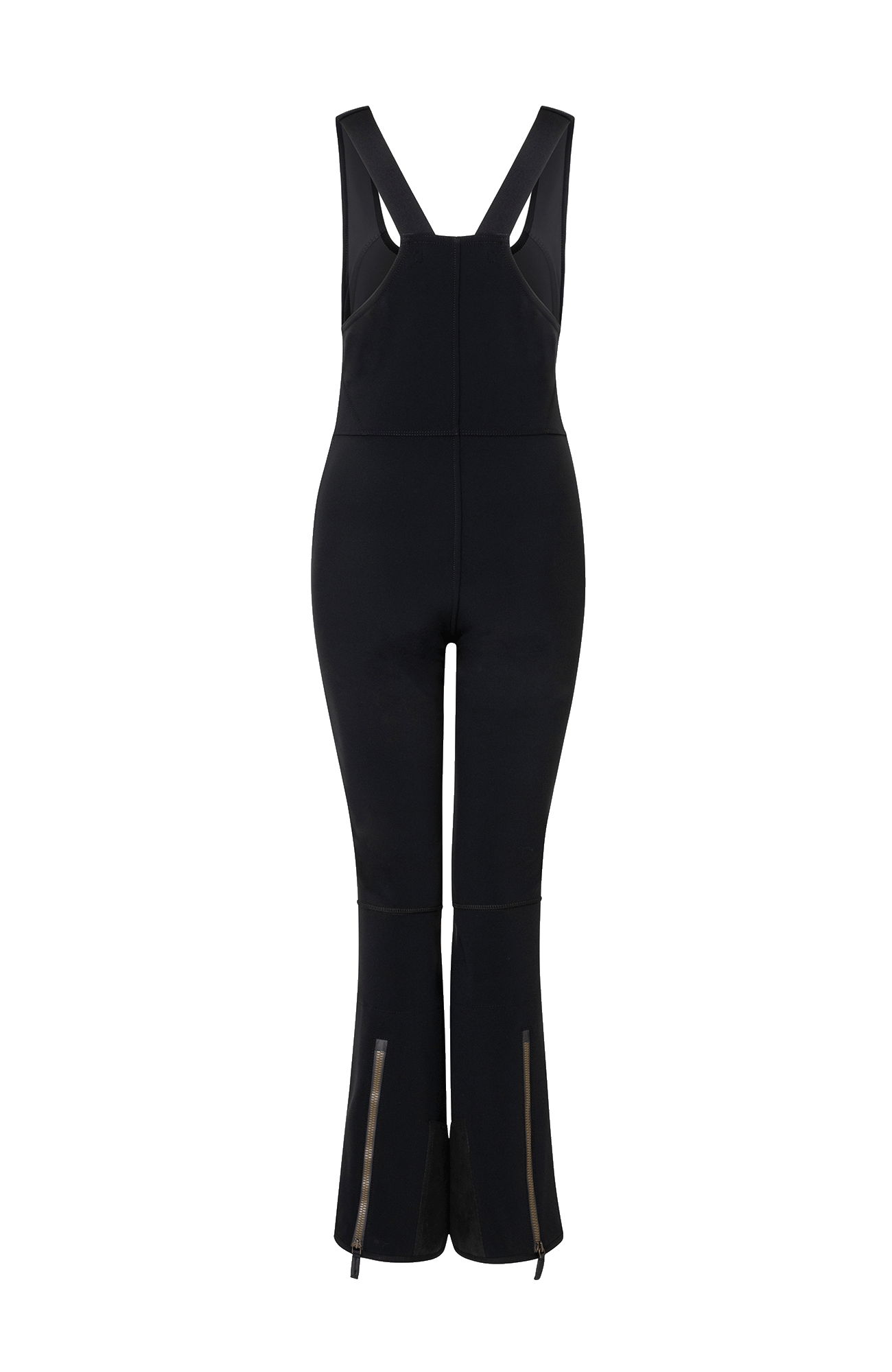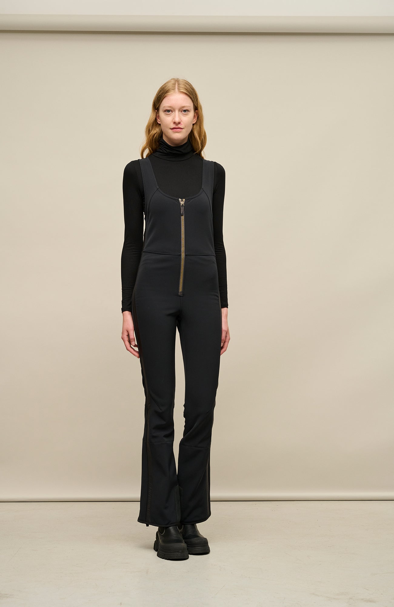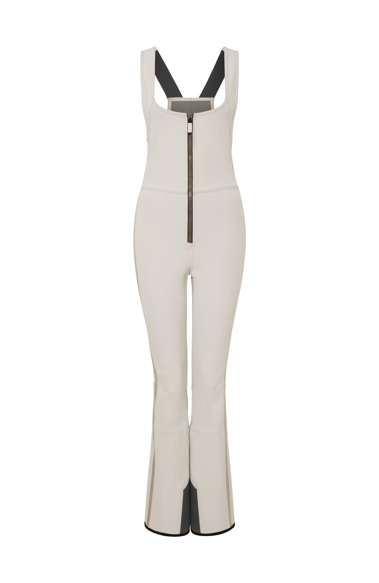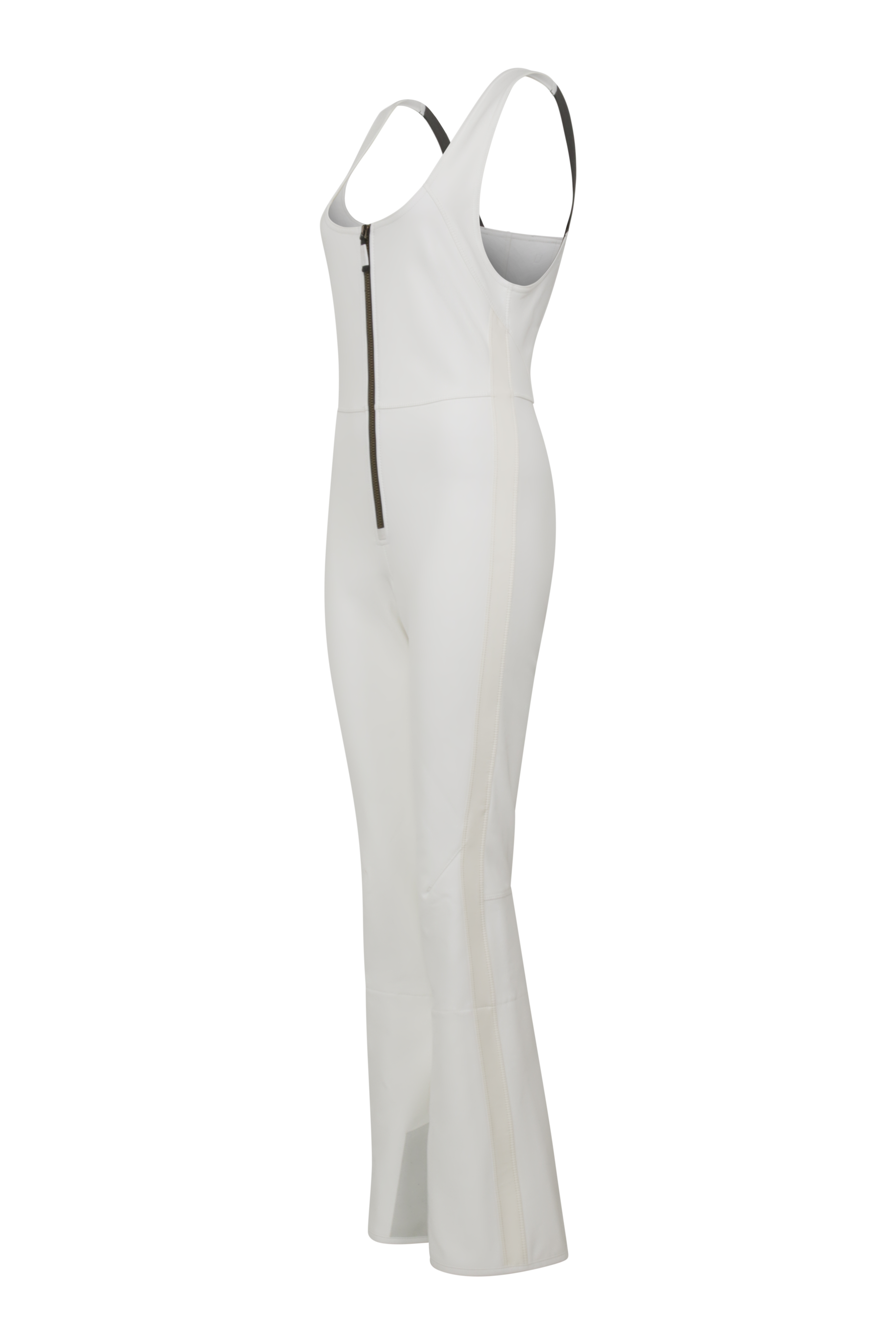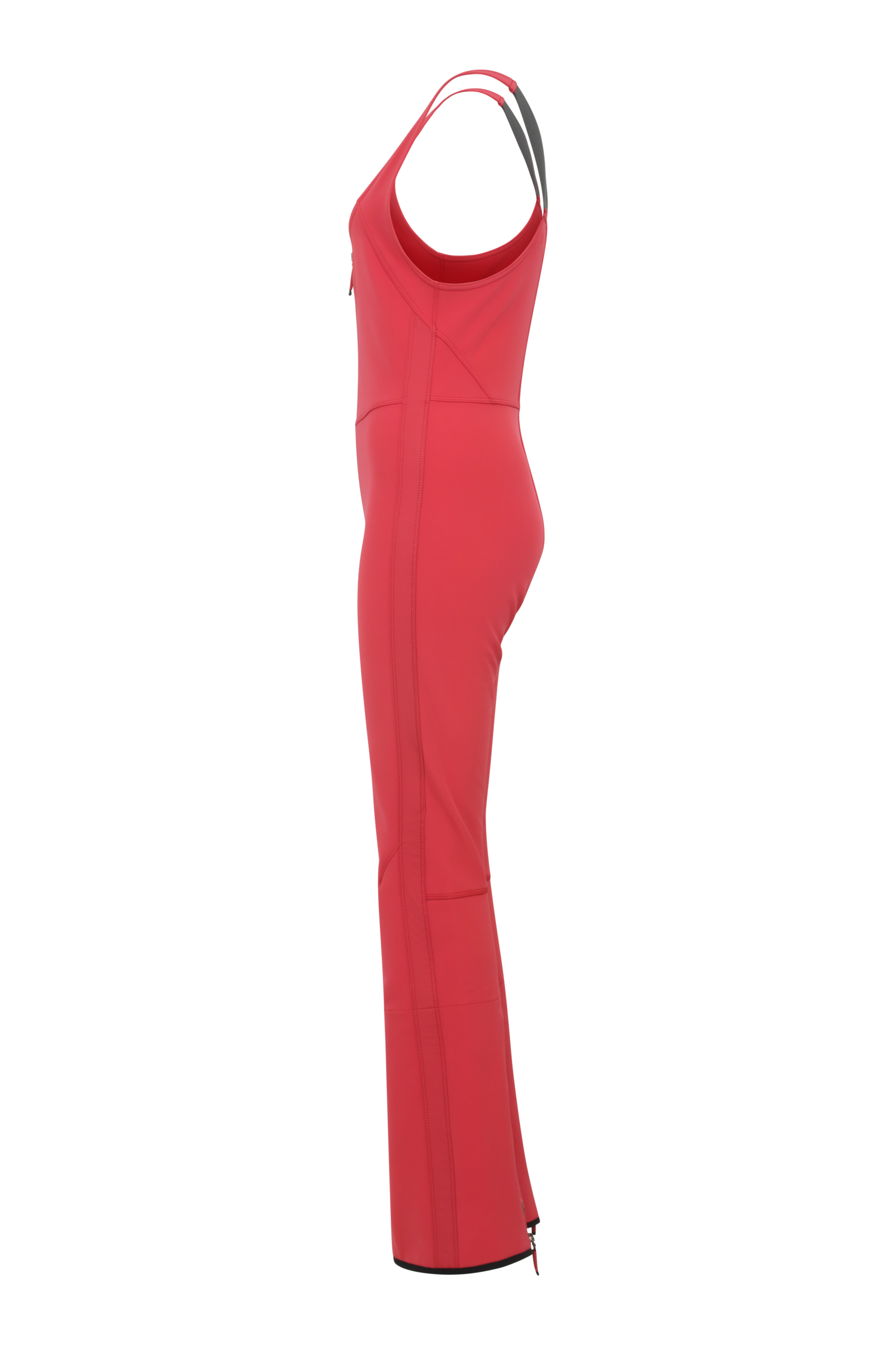 The tight-fitting ski overall emphasizes the feminine silhouette with striking seams and a bustier neckline.