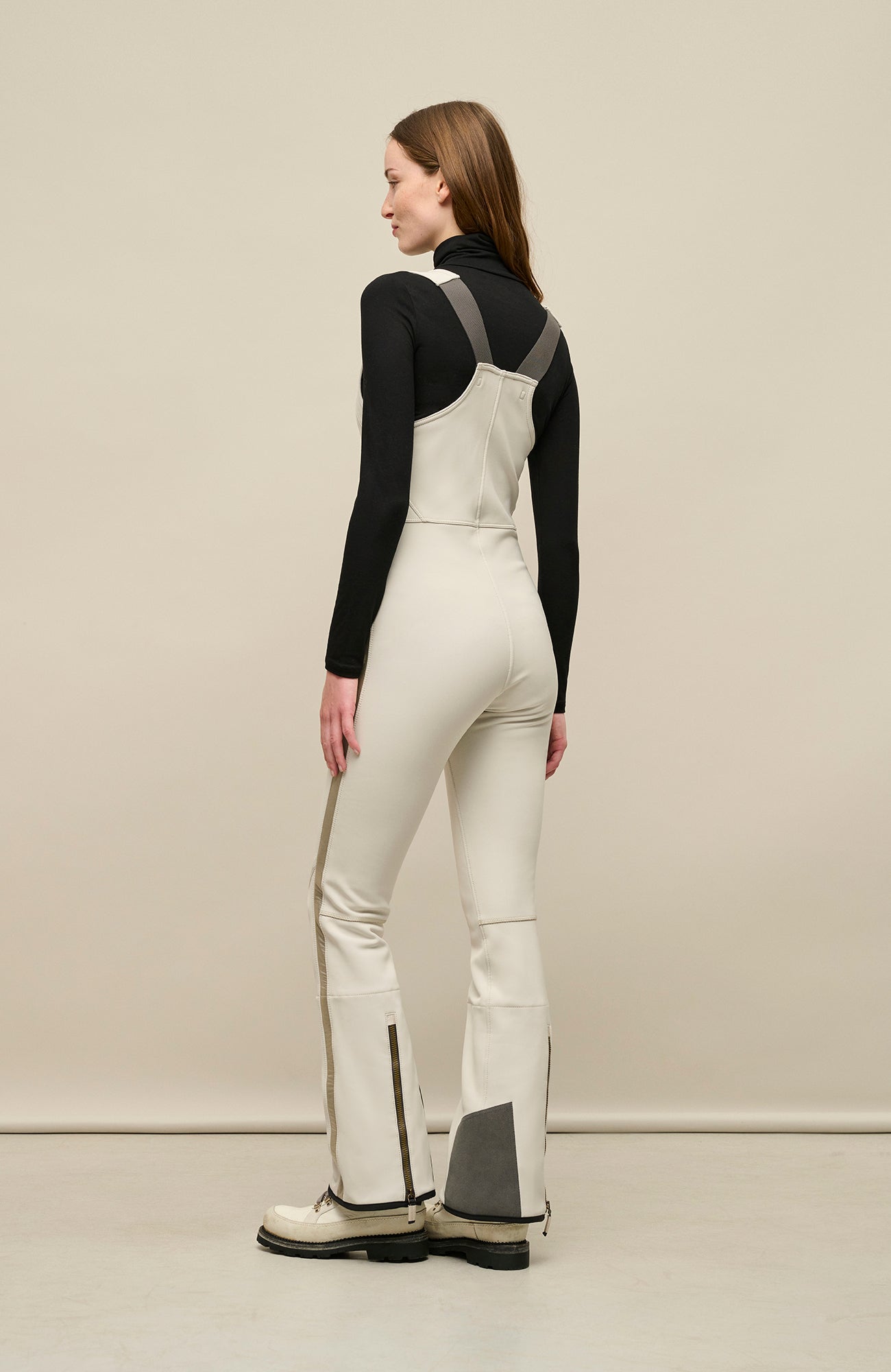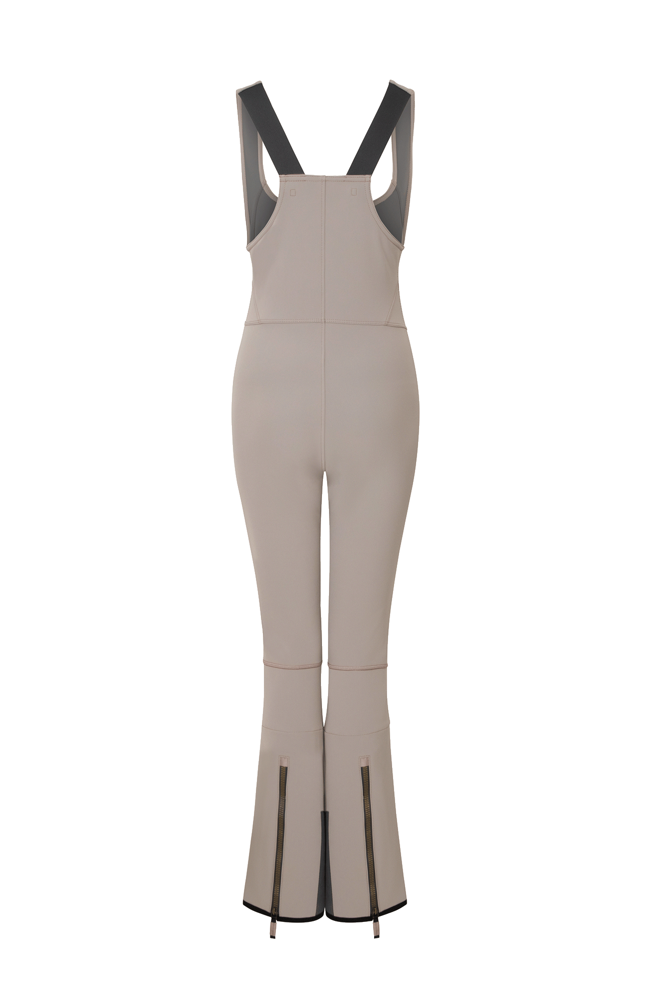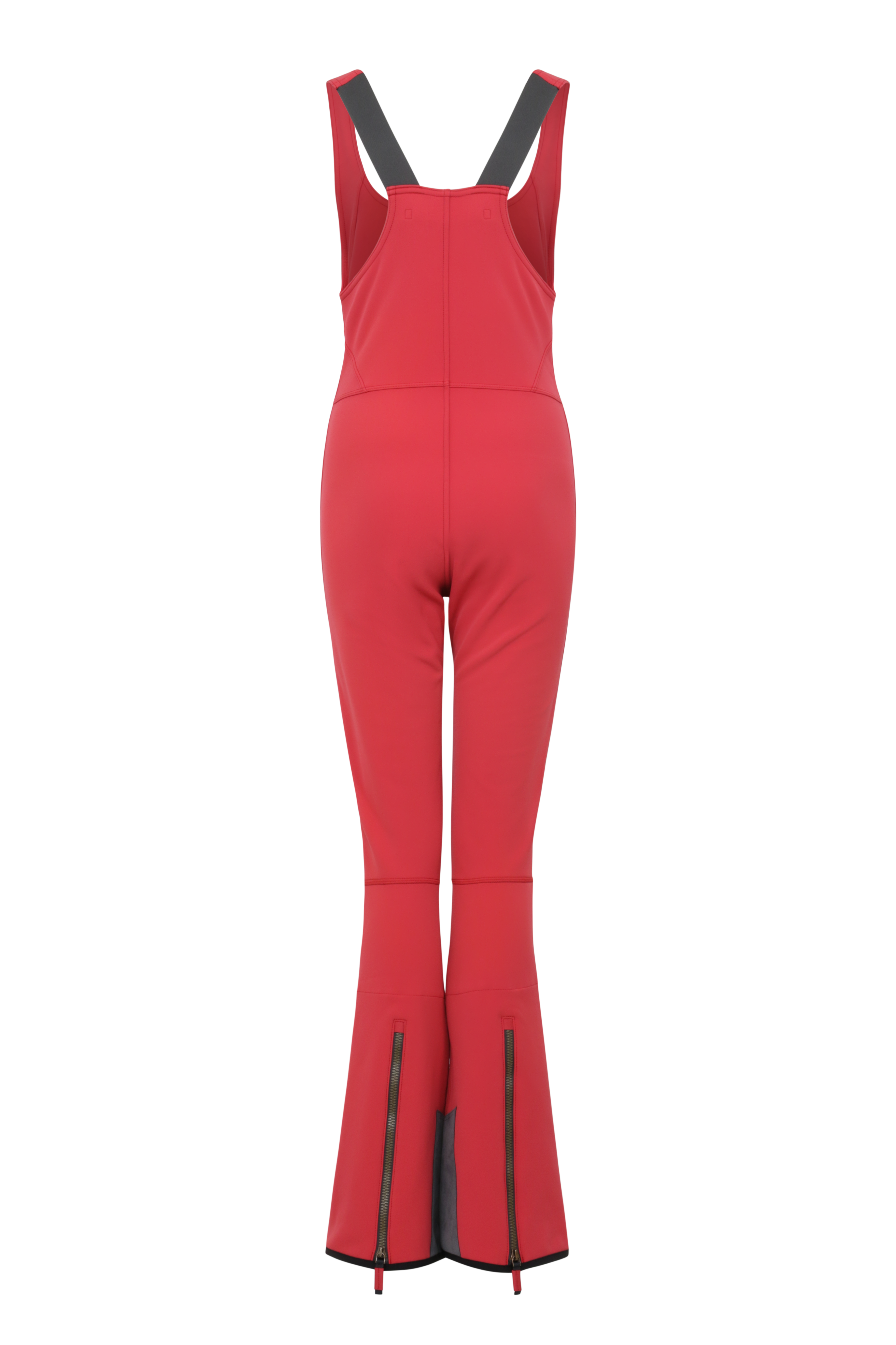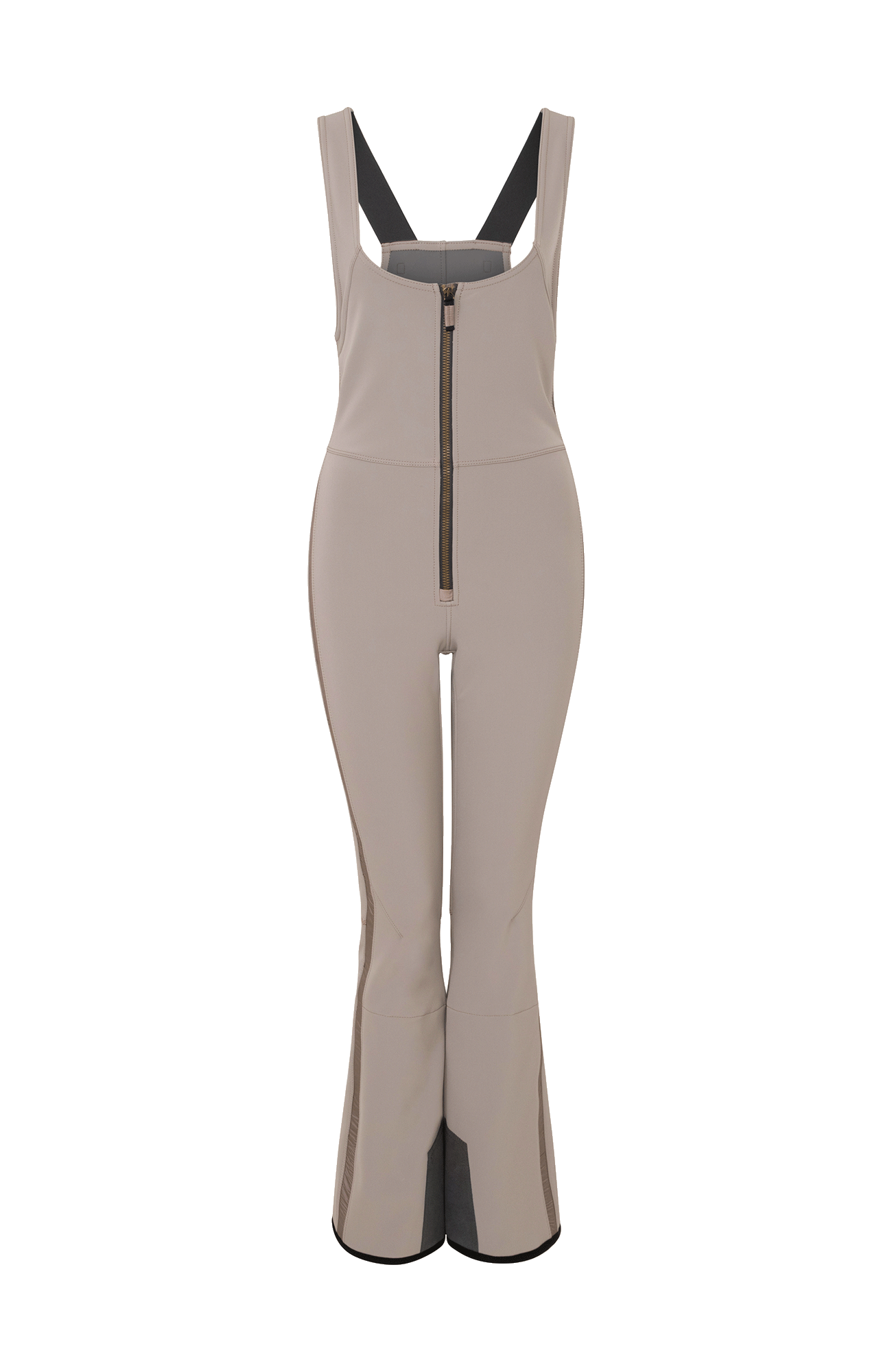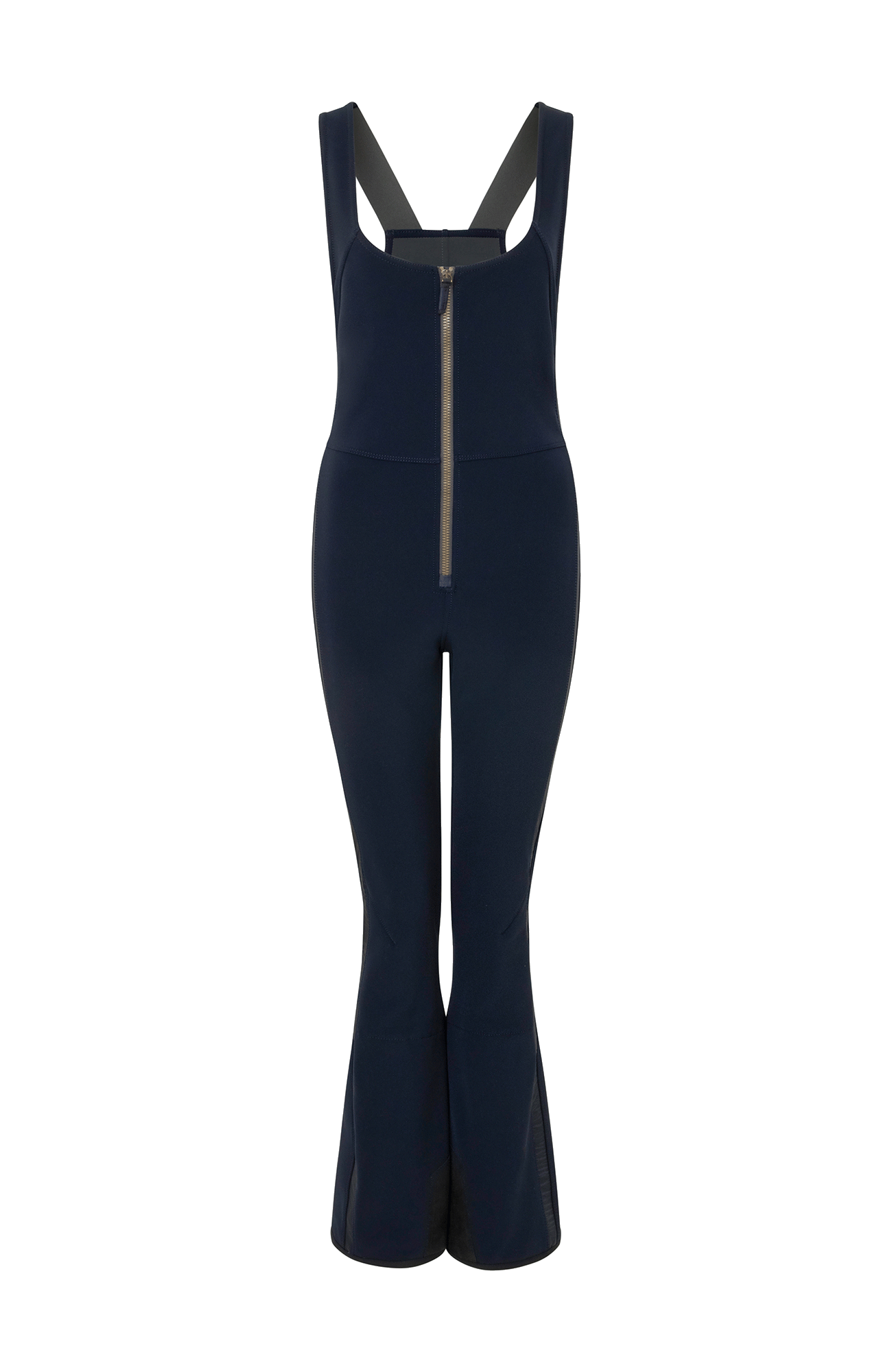 The tight-fitting ski overall emphasizes the feminine silhouette with striking seams and a bustier neckline.