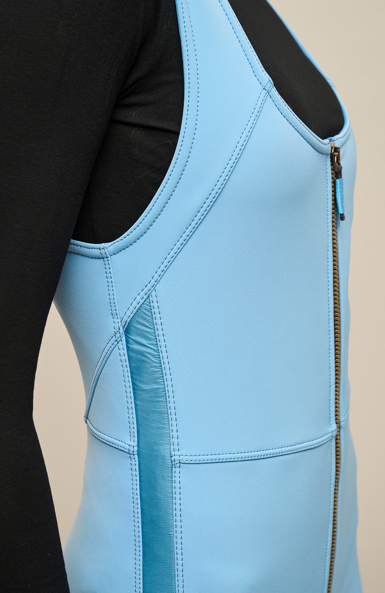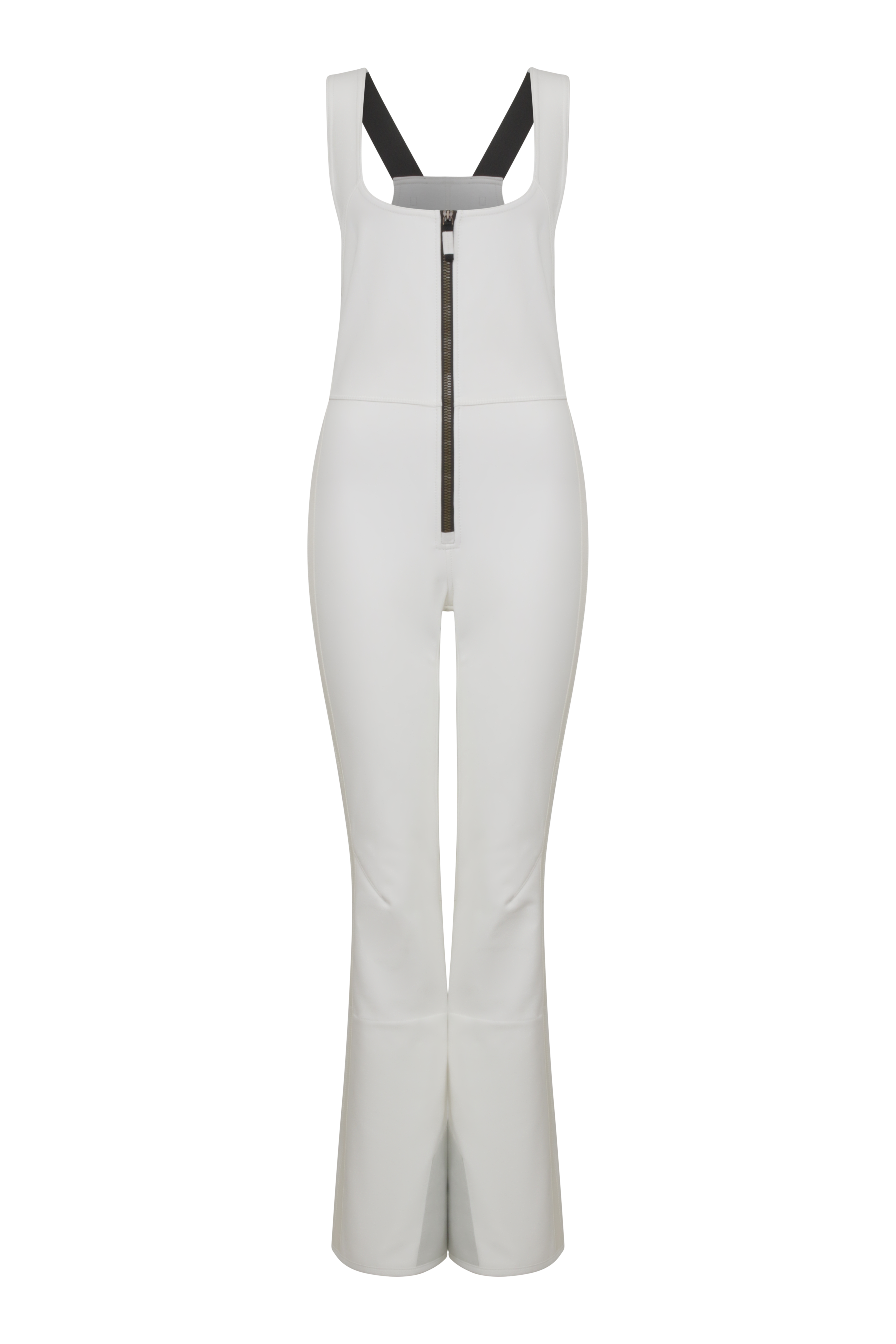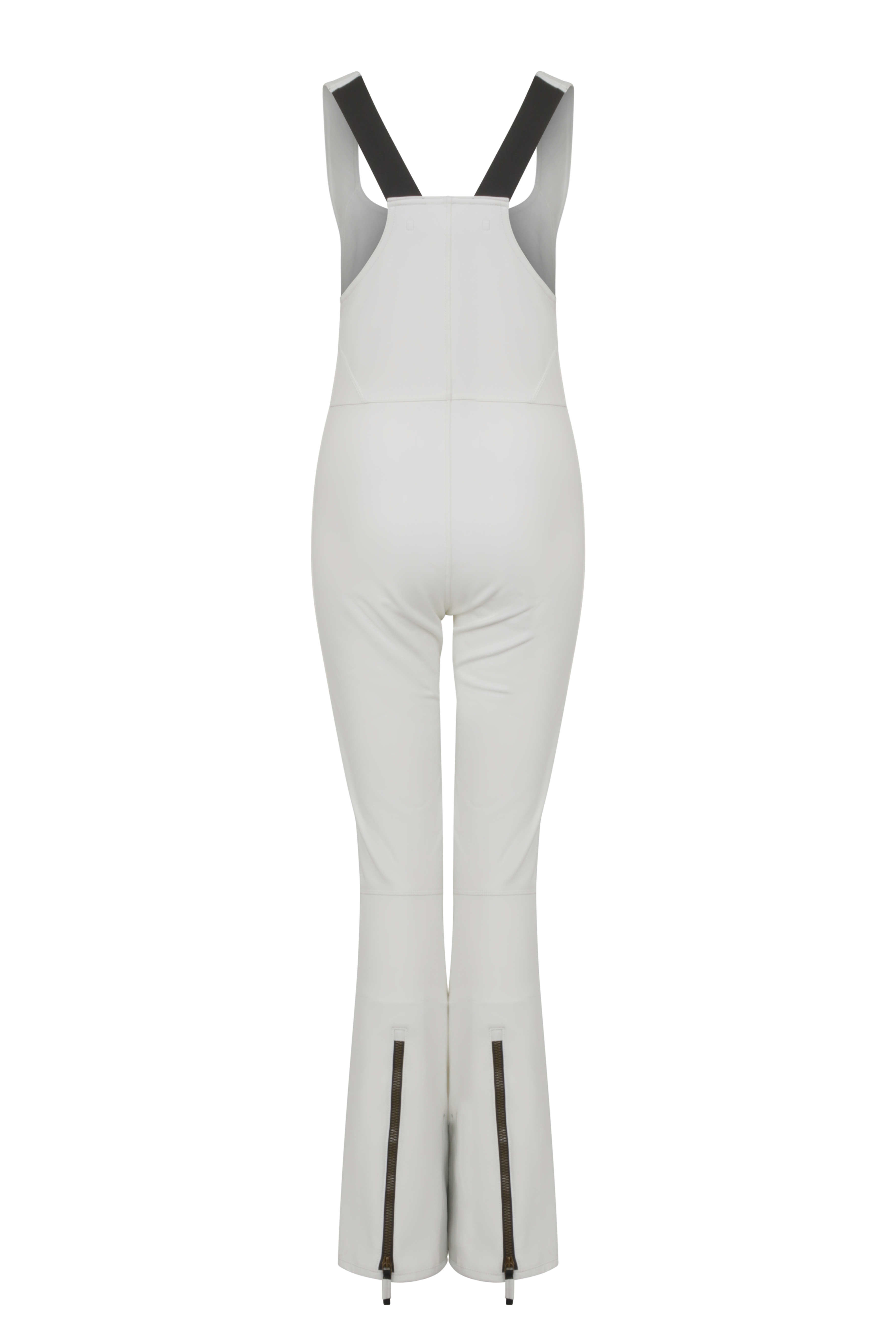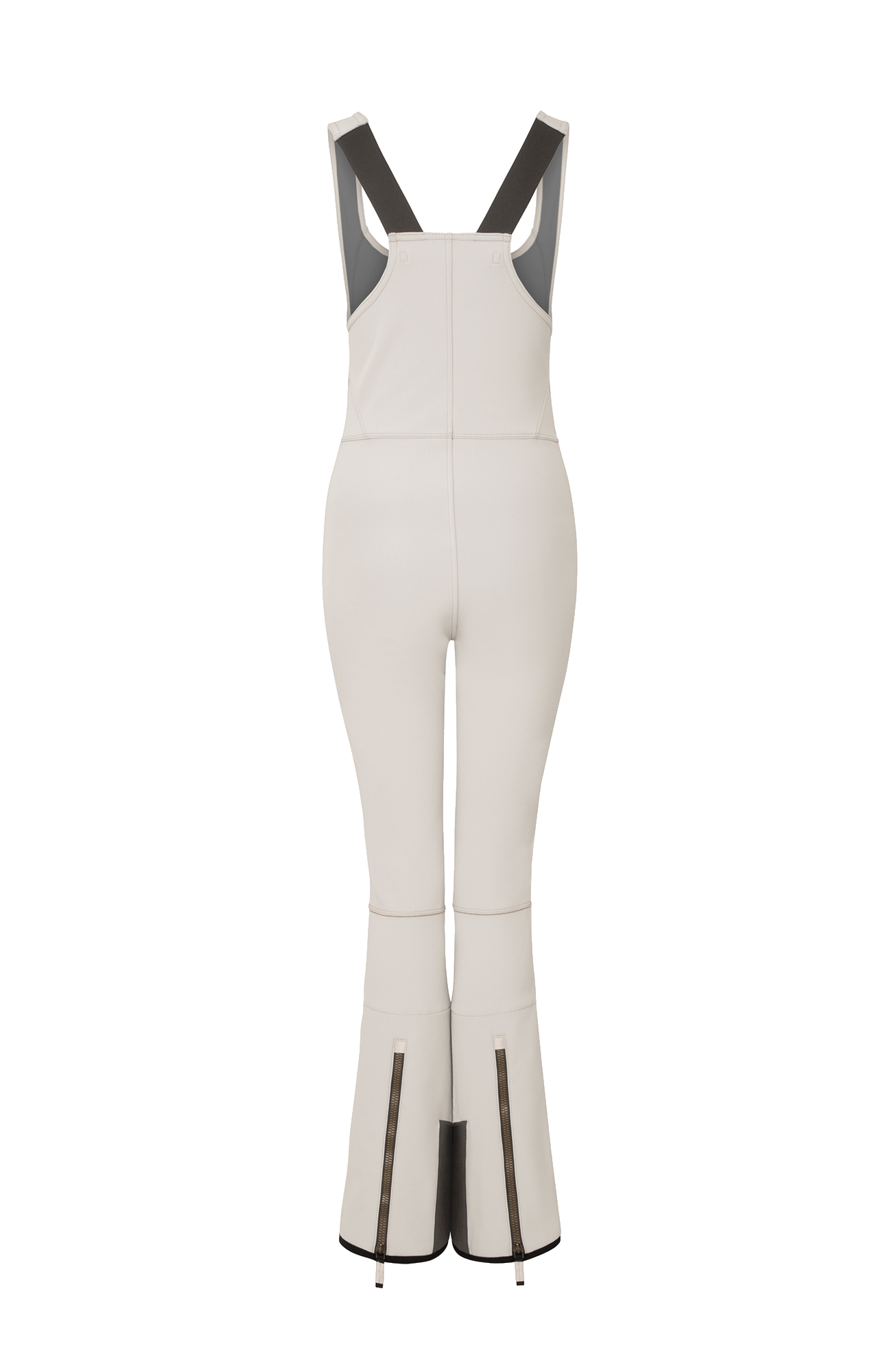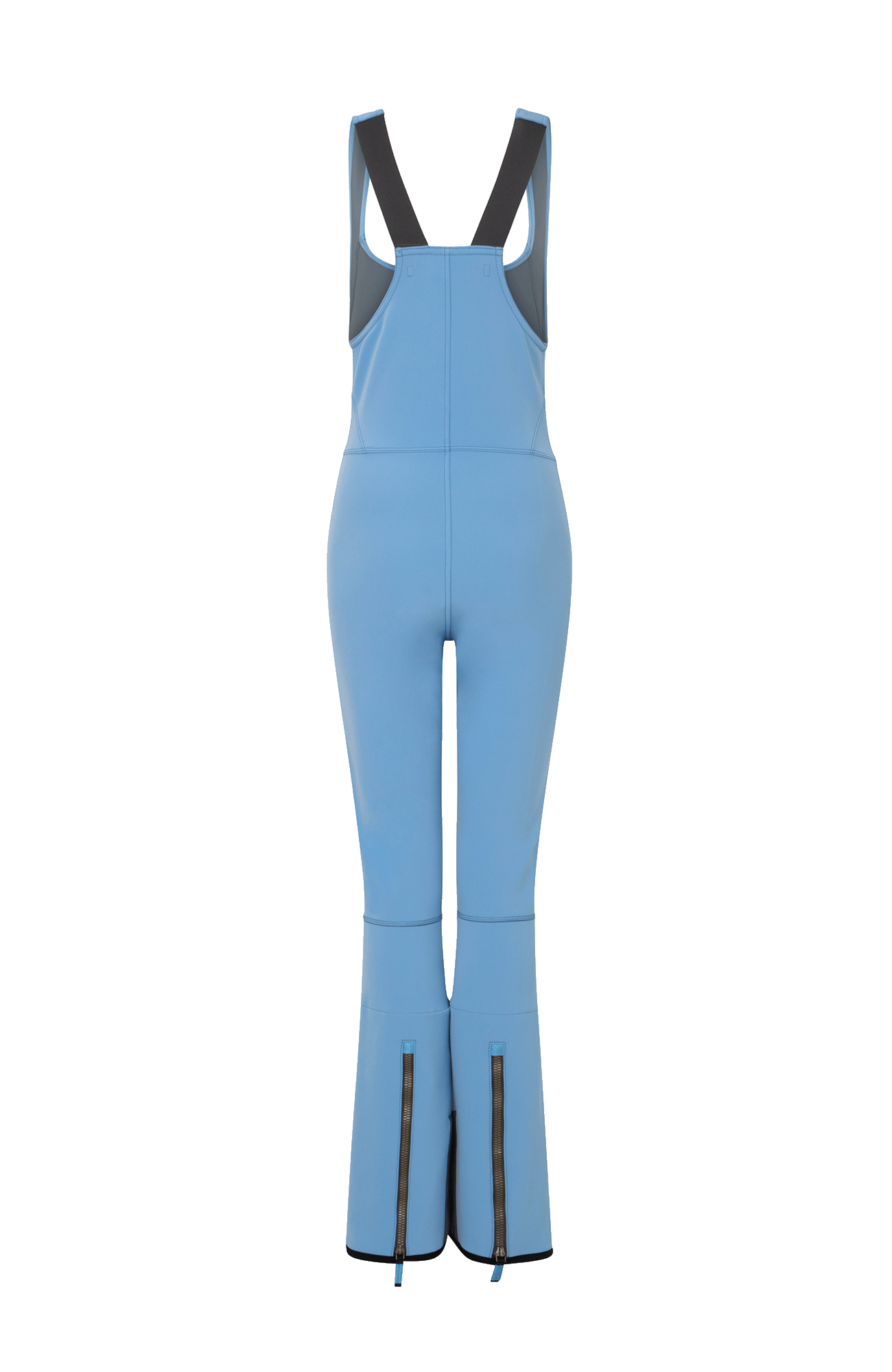 The tight-fitting ski overall emphasizes the feminine silhouette with striking seams and a bustier neckline.