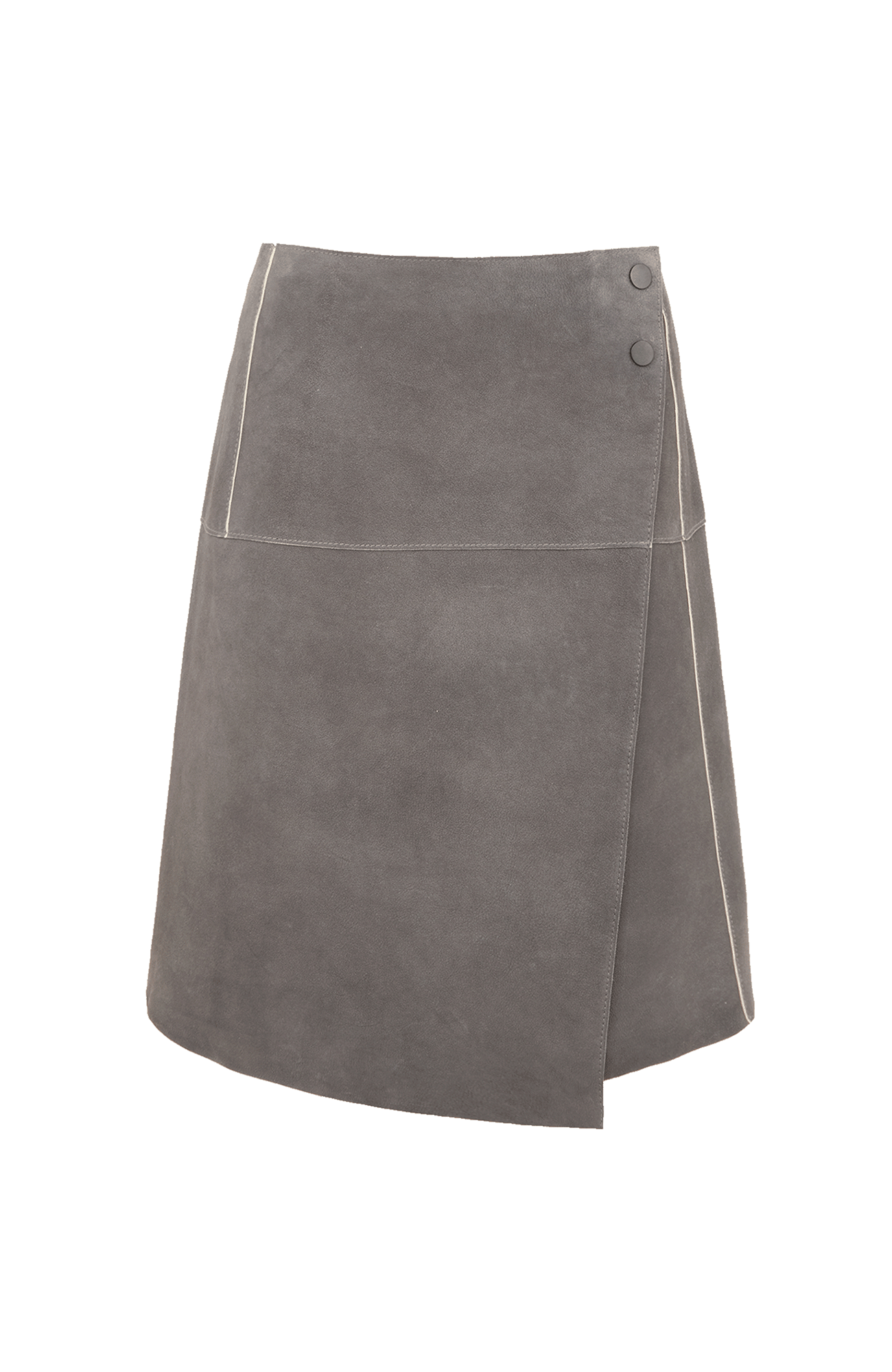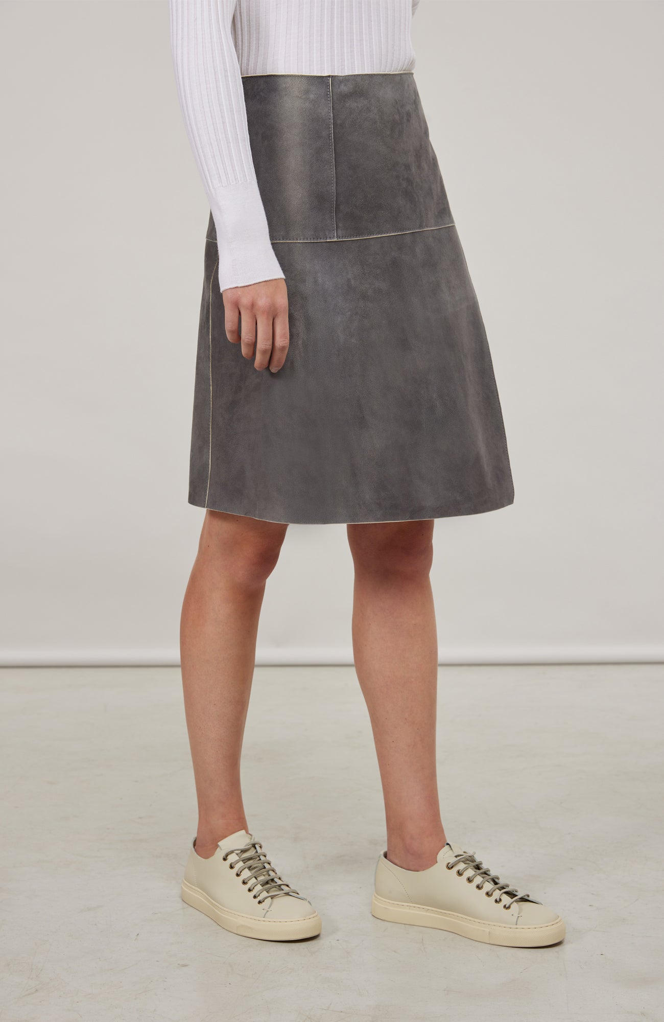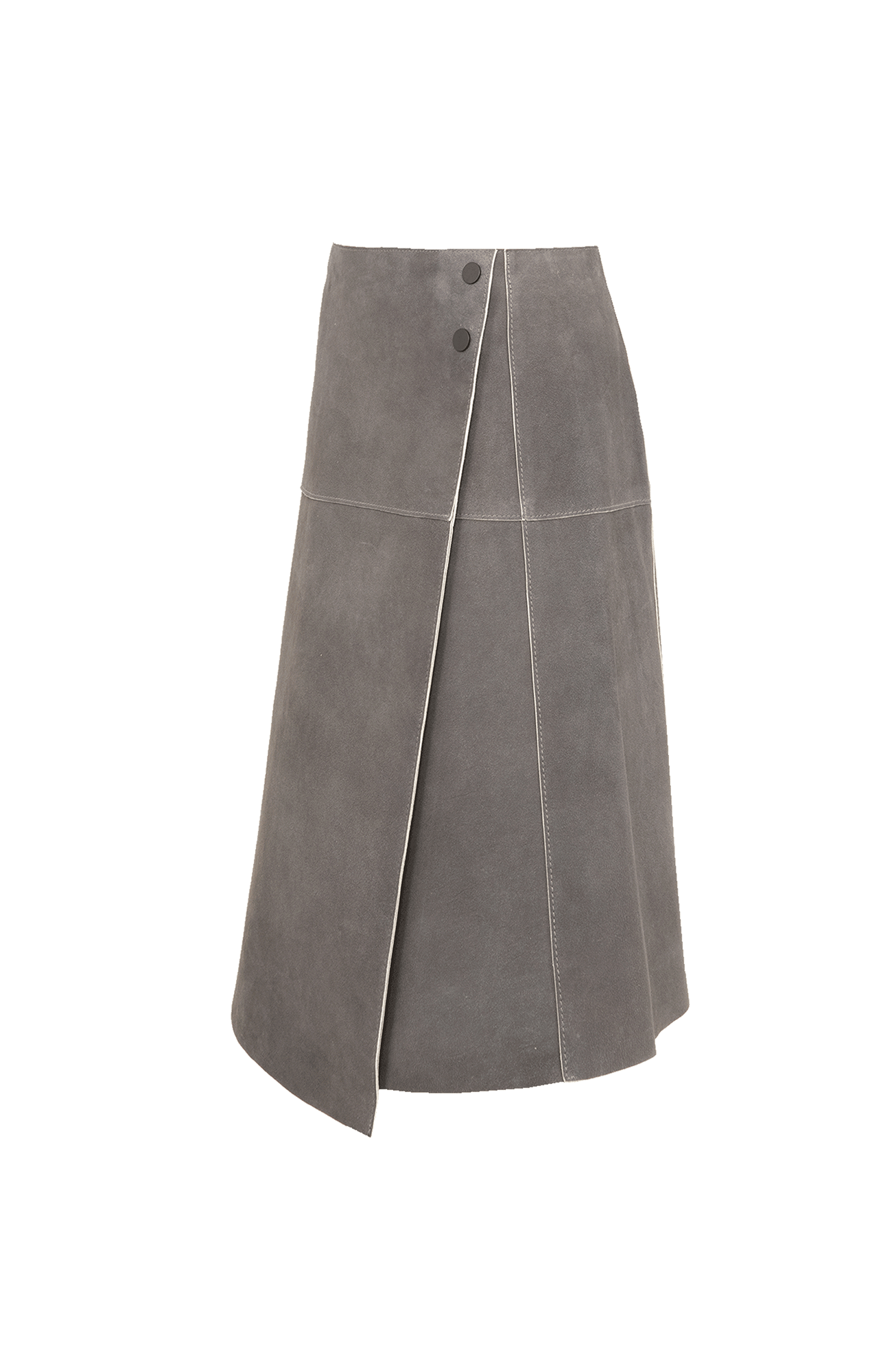 This fashionable wrap skirt made of ecologically dyed and tanned lambskin suede feels soft against the skin. The leather wraps casually and playfully around the legs in an asymmetrical length with geometric patchwork seams, creating a slim silhouette. The firm waistband, reinforced with grosgrain ribbon, and the two safety snap fasteners on the side provide optimal support. The leather skirt is partially lined for even greater comfort.