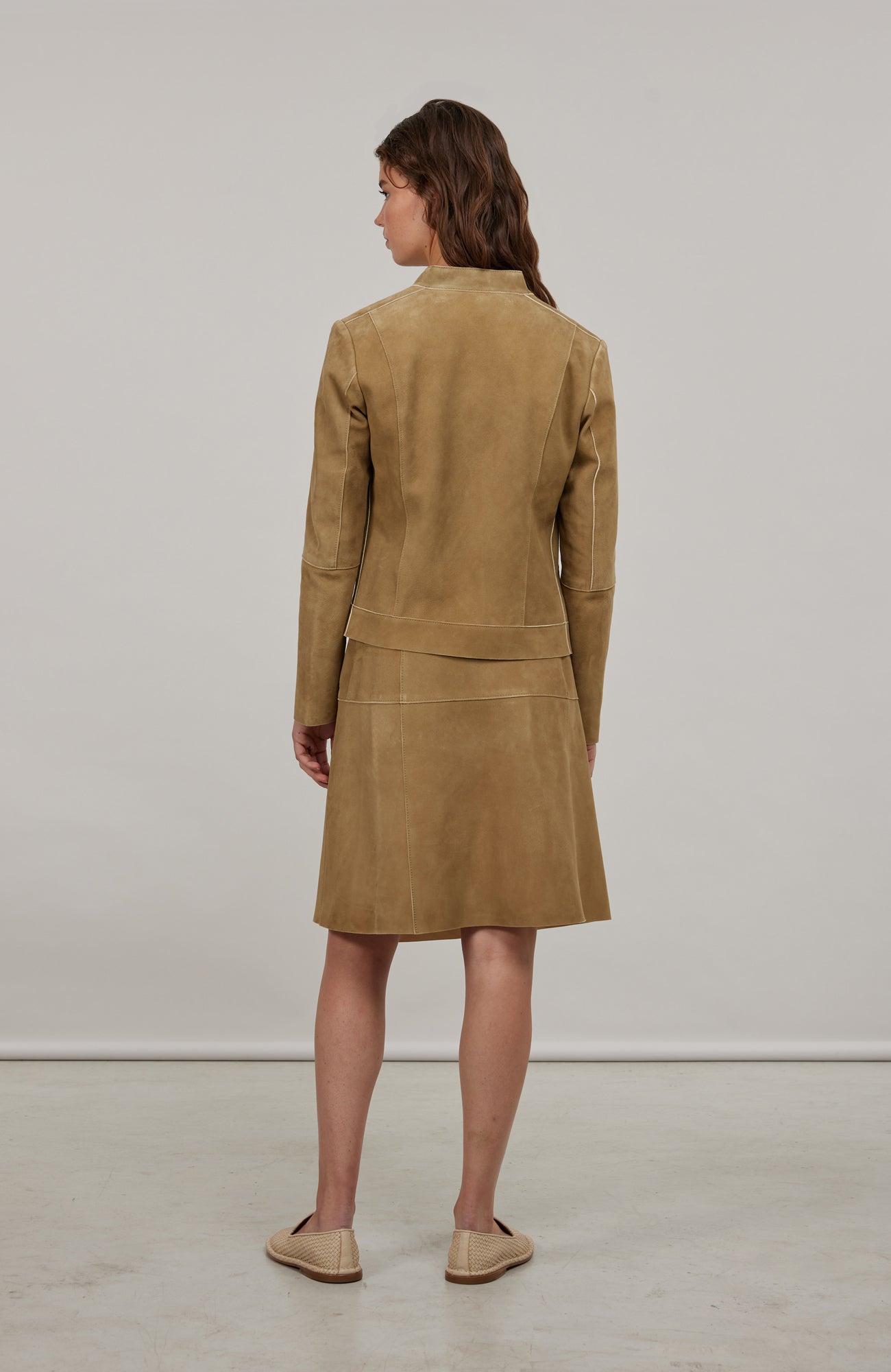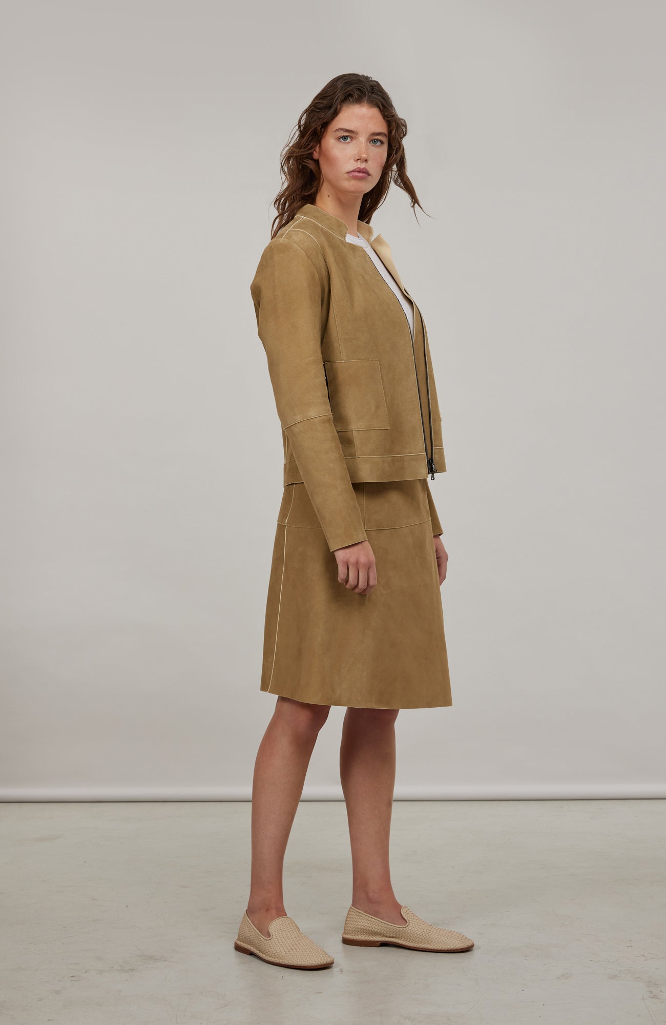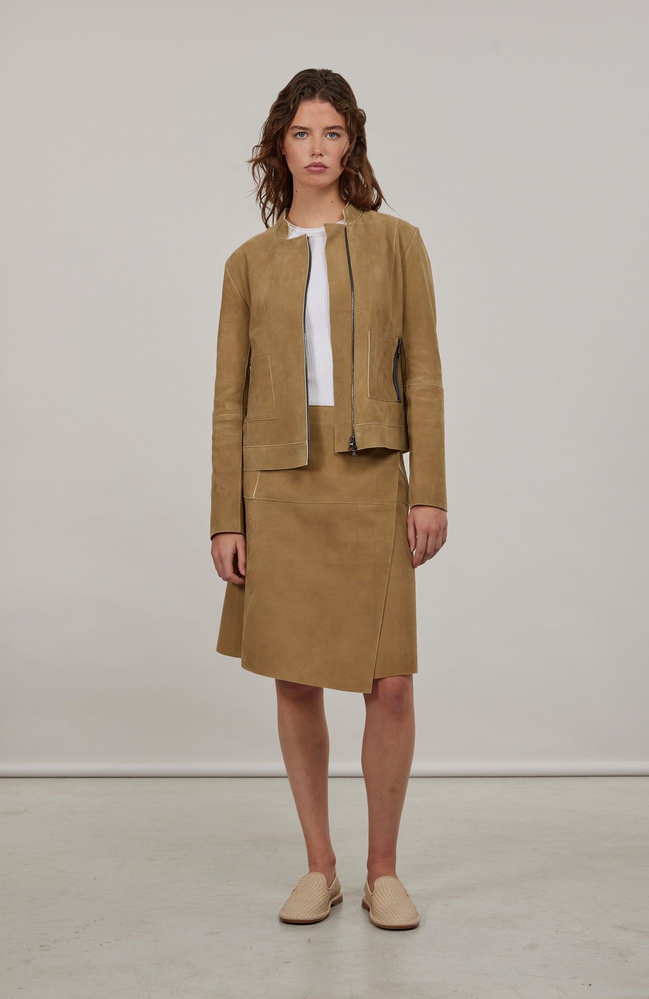 This fashionable wrap skirt made of ecologically dyed and tanned lambskin suede feels soft against the skin. The leather wraps casually and playfully around the legs in an asymmetrical length with geometric patchwork seams, creating a slim silhouette. The firm waistband, reinforced with grosgrain ribbon, and the two safety snap fasteners on the side provide optimal support. The leather skirt is partially lined for even greater comfort.