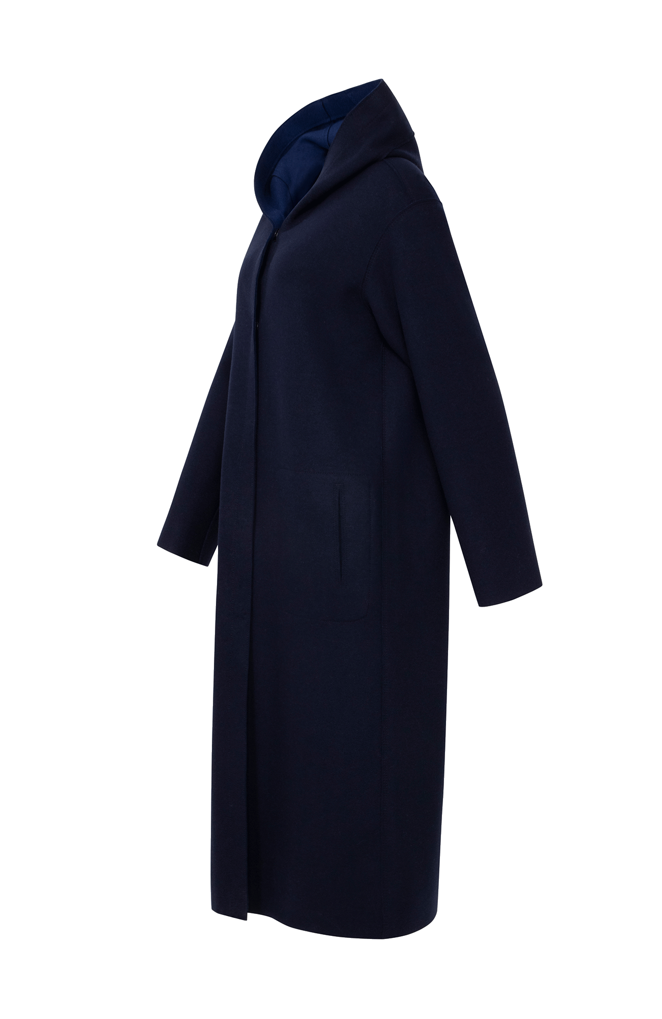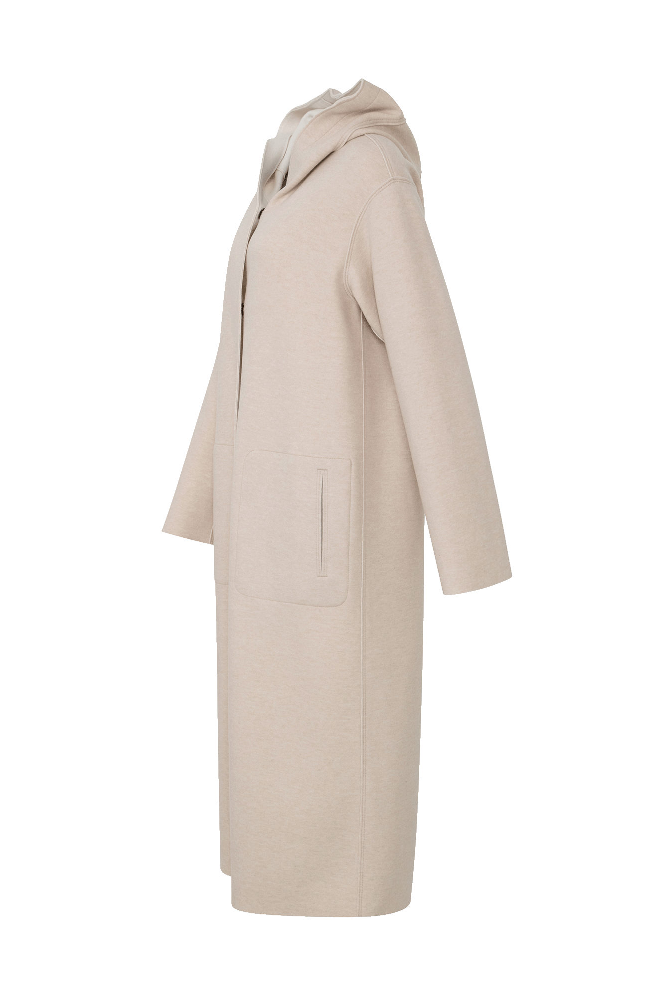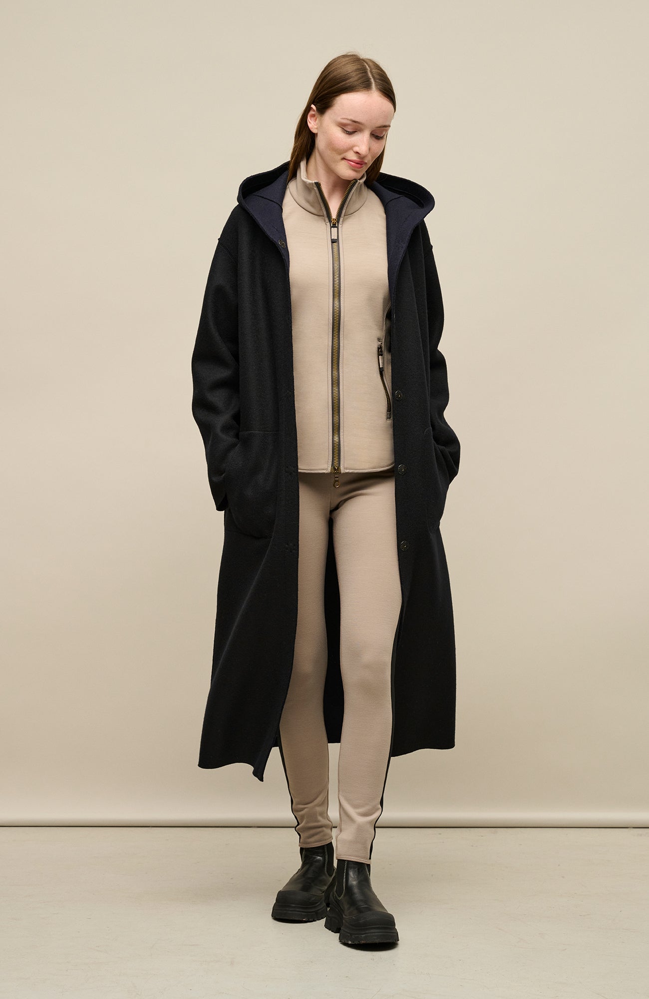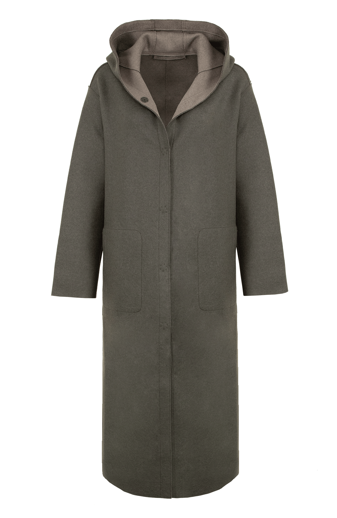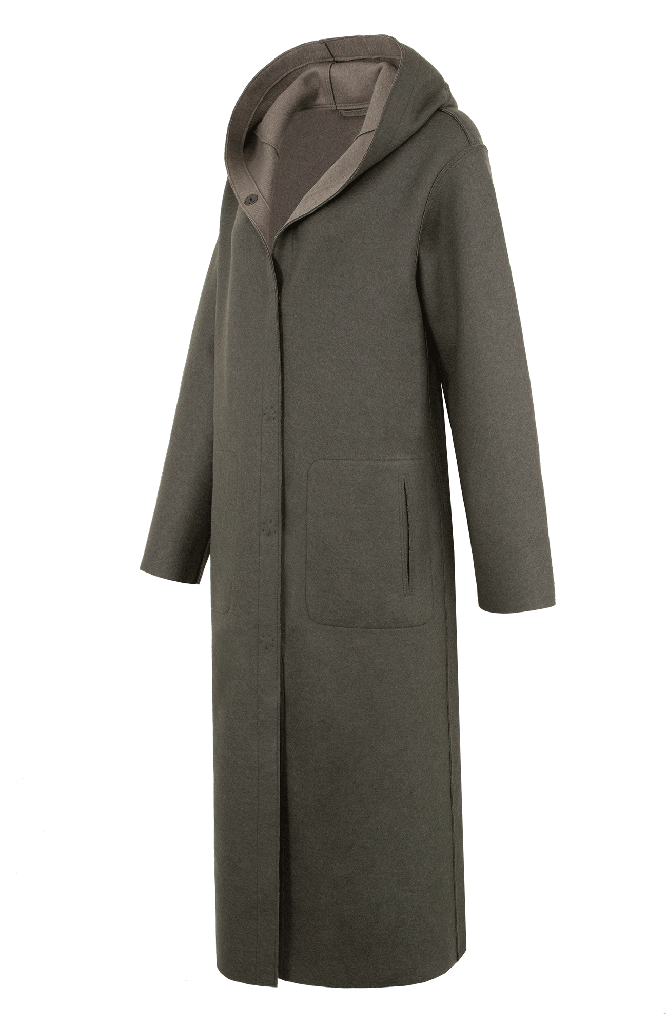 Soft, warm and breathable, the wool coat made of Wool Double hugs the body. Thanks to the double processing, the coat can be worn on both sides, creating two looks. The generous length of the coat is striking. The details are of high quality, for example the hand-sewn snap fasteners or the attached hood. The side pockets are sewn with a fine seam and turn into patch pockets on the other side of the coat.