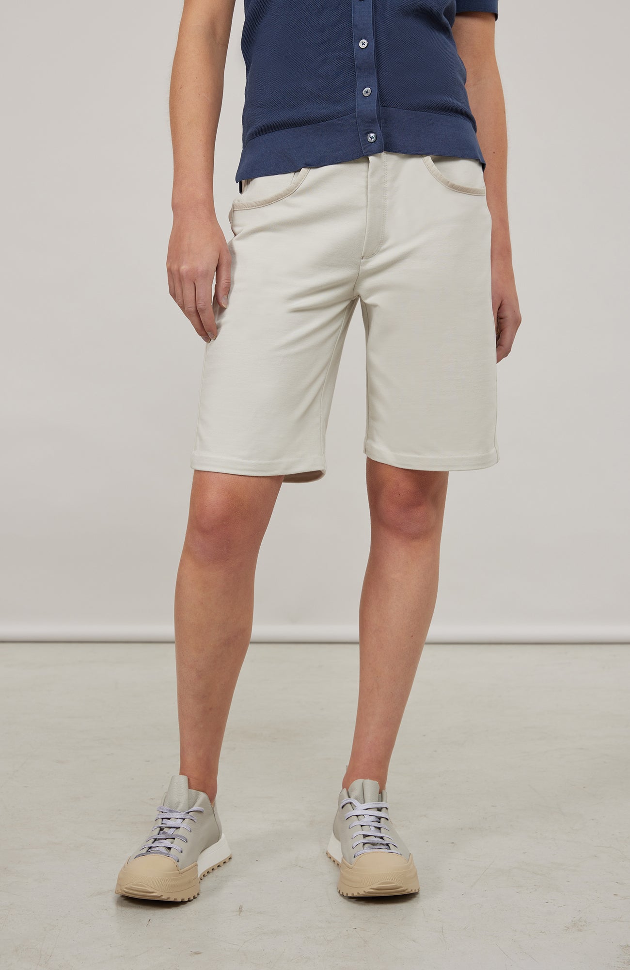 This modern women’s Bermuda shorts impress with their high-quality cotton blend featuring innovative natural power stretch, combining freedom of movement, comfort, and durability. The material feels soft against the skin, providing a pleasant wearing experience all day long. Practical side pockets with Alcantara leather trim add a stylish, premium touch. A versatile must-have for fashion-conscious women, ideal for relaxed casual or urban looks.