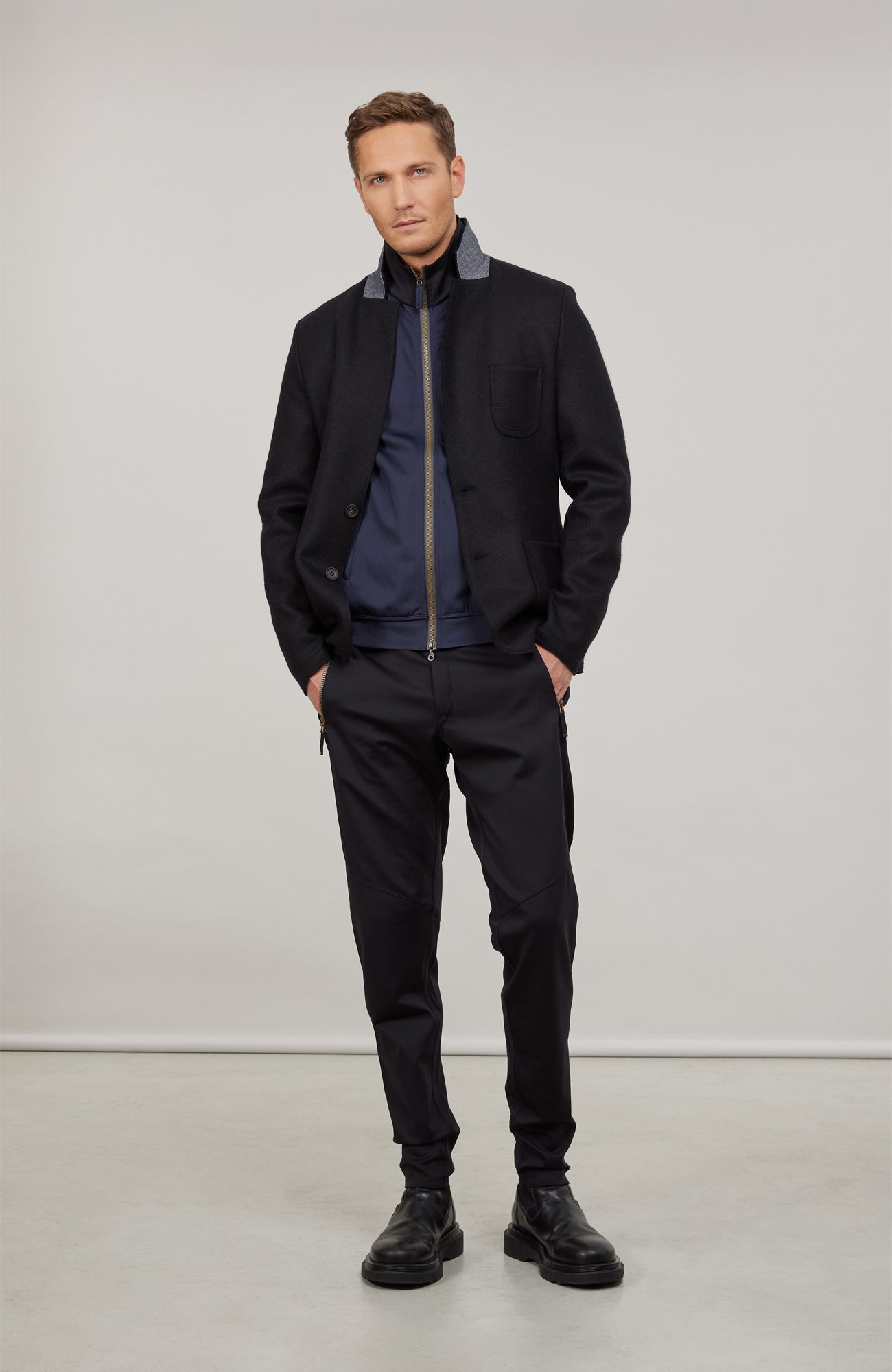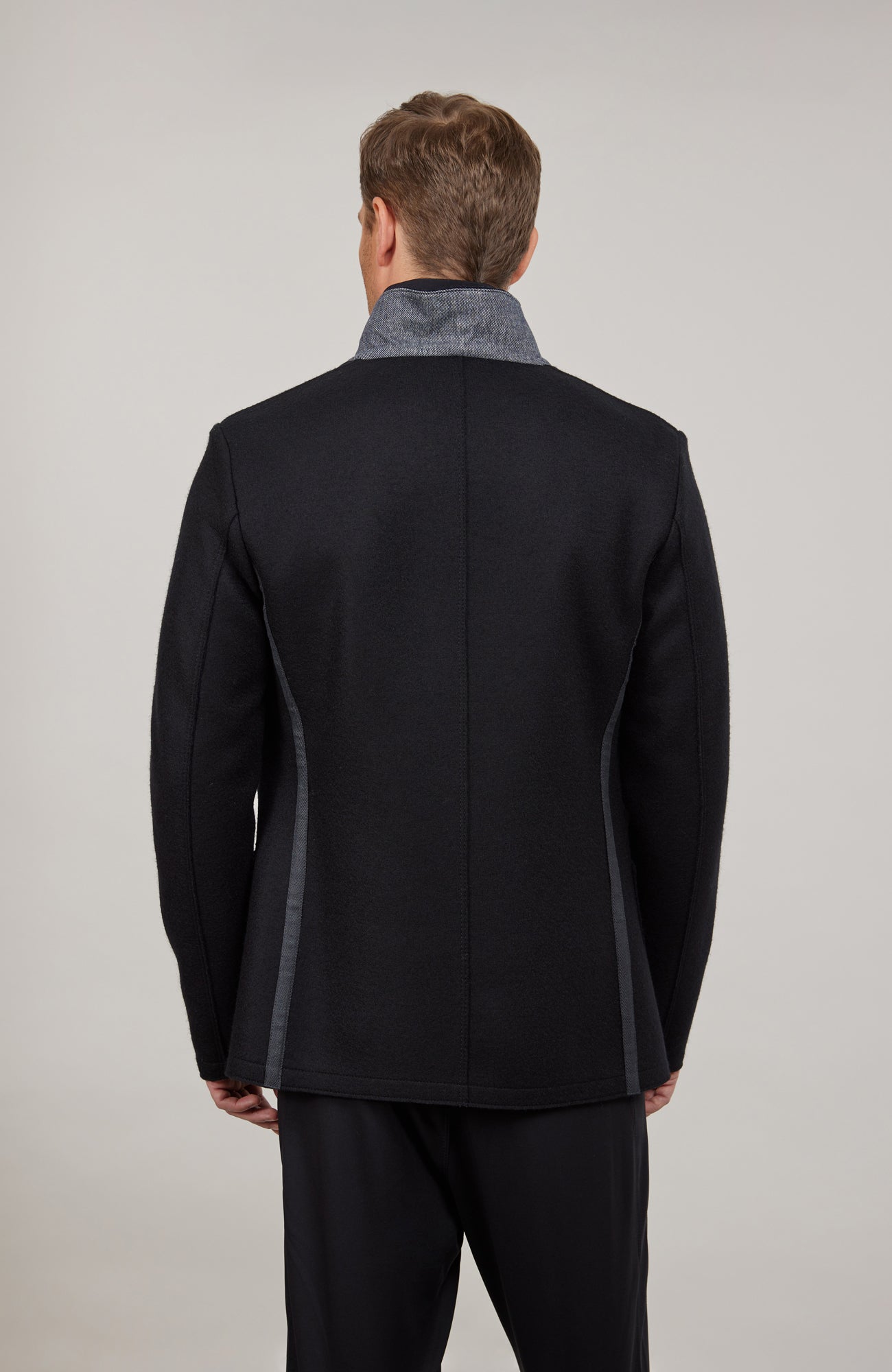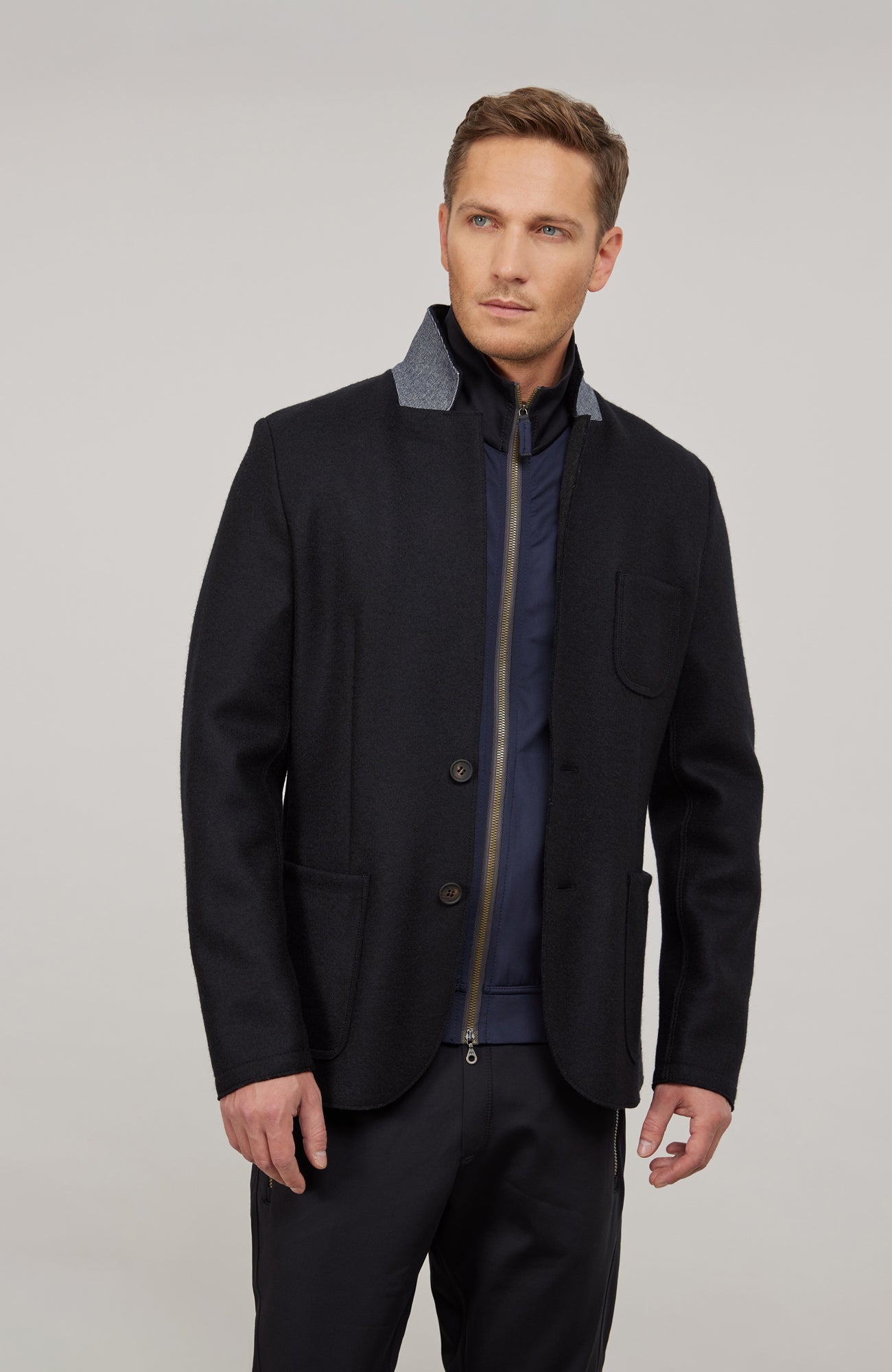 A particularly soft double made of merino wool, which has been combined with an invisible, ultra-fine nylon yarn. The collar is lined with canvas fabric, which creates a nice colour contrast.