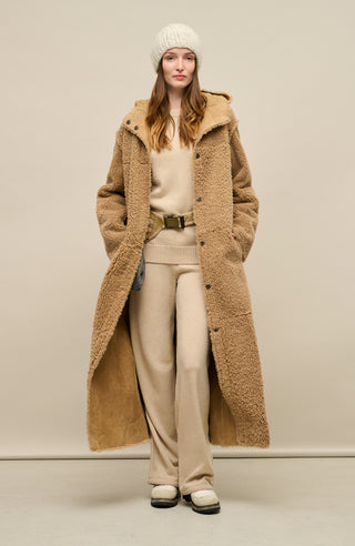 Neutrale Töne: der Mantel Sanna, mit dem Kaschmirset Leyla und Hailey. Kombiniert mit Mütze Kathi und unserer Leder Beltbag.