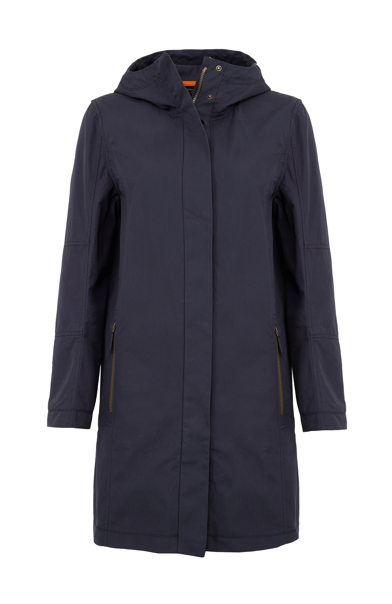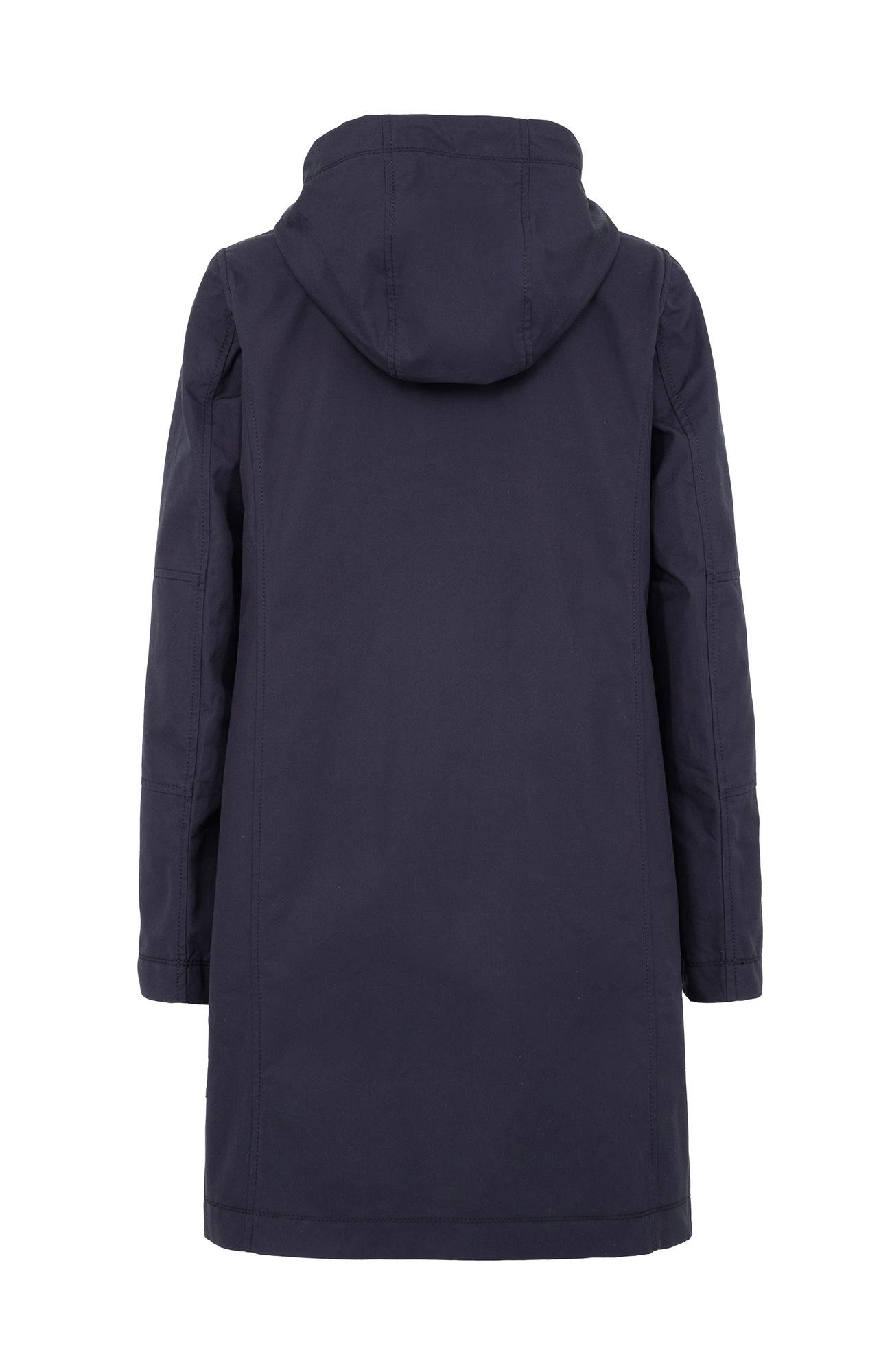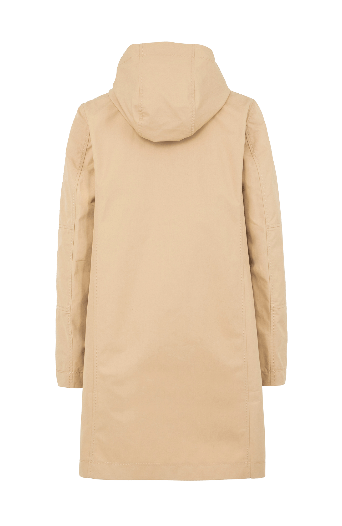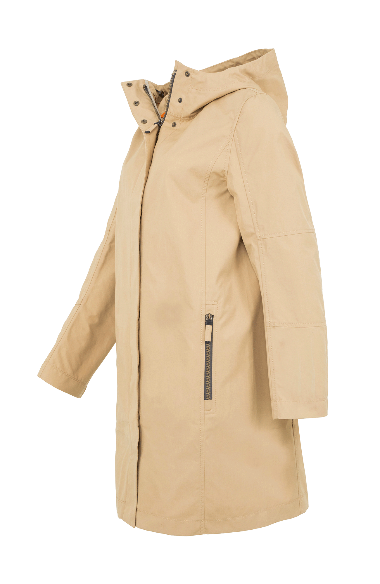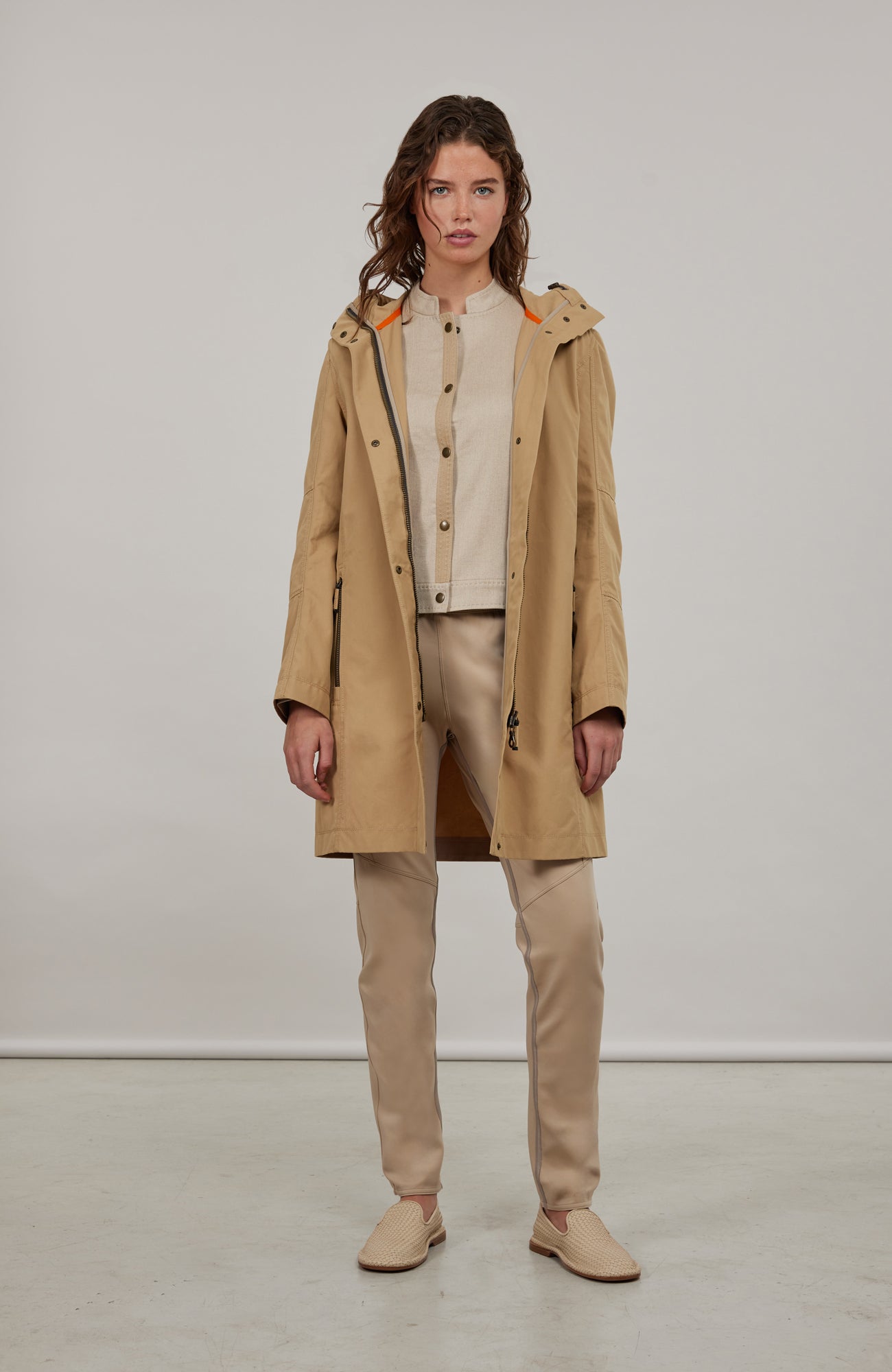 Dank einer besonderen Webtechnik der Baumwolle ist der Mantel wasser- und windabweisend, ohne betont funktional zu wirken. Für sportliche Eleganz sorgen die Kapuze und die Taschen mit markantem Zipper.