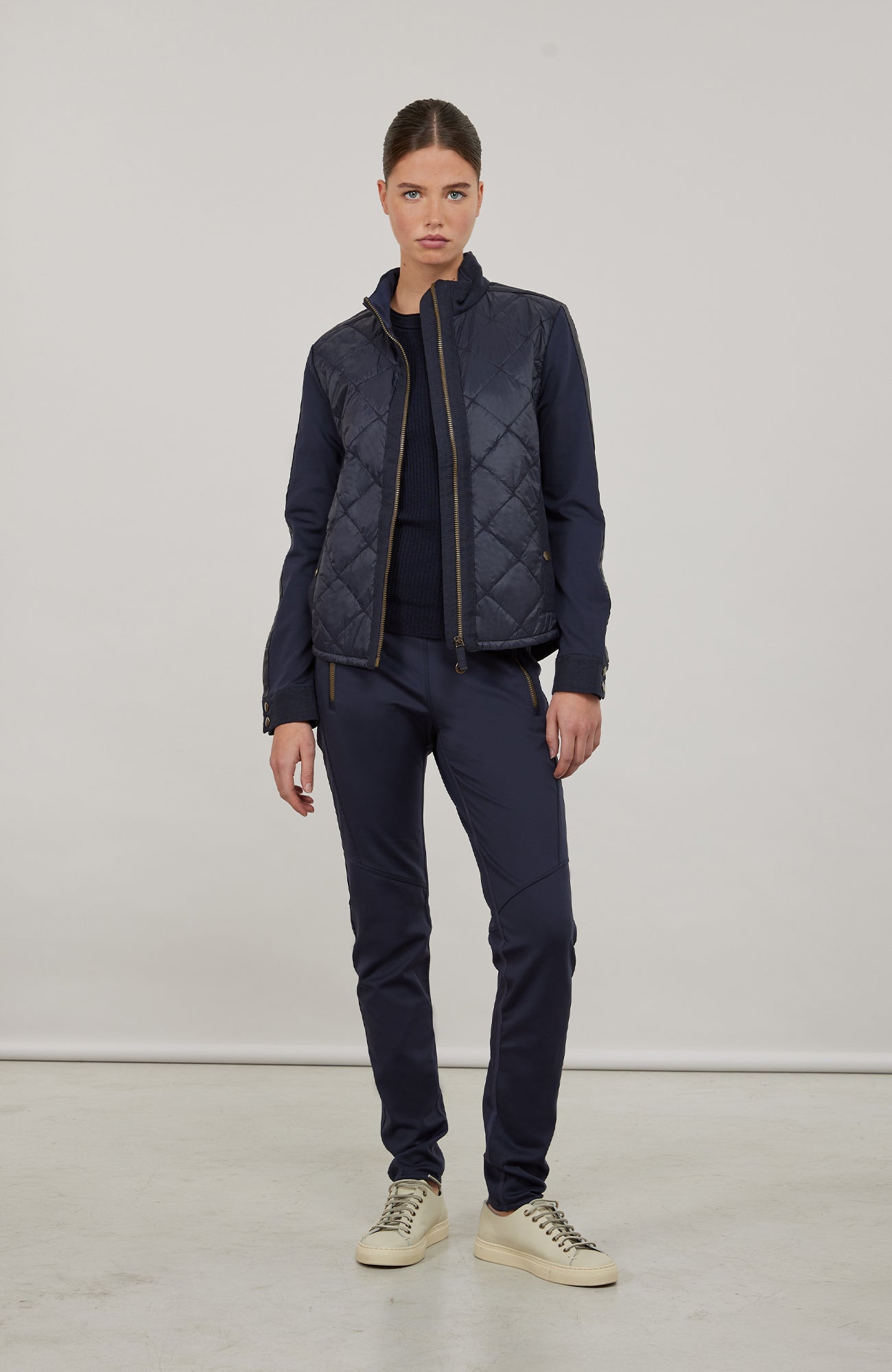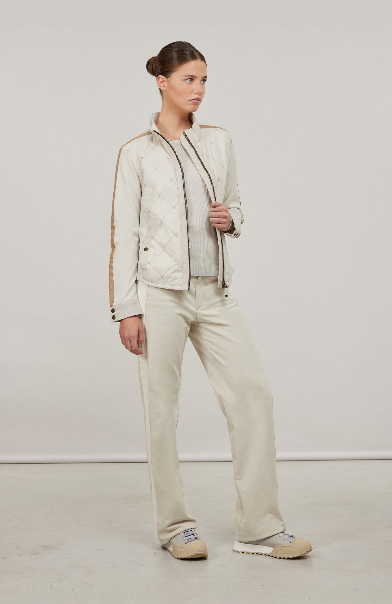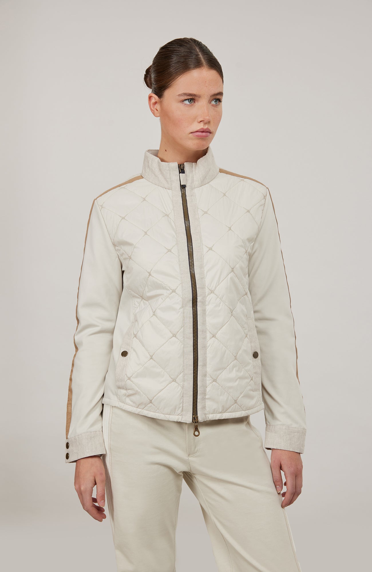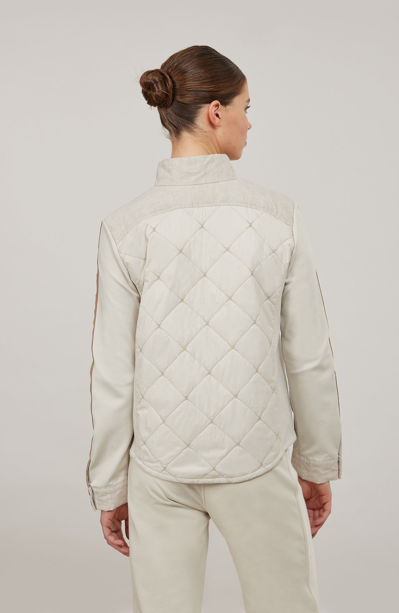 Diese locker-legere Jacke überzeugt durch ihre durchdachte Kombination aus Quilt-Steppung, innovativem Natural Powerstretch und hochwertigem Leinen-Materialmix. Der moderne Schnitt sorgt für ein angenehmes Tragegefühl, während sorgfältig platzierte Leinen-Einsätze an Kragen, Ärmelbündchen und Schultern eine individuelle Silhouette und einen besonderen Charakter verleihen.
